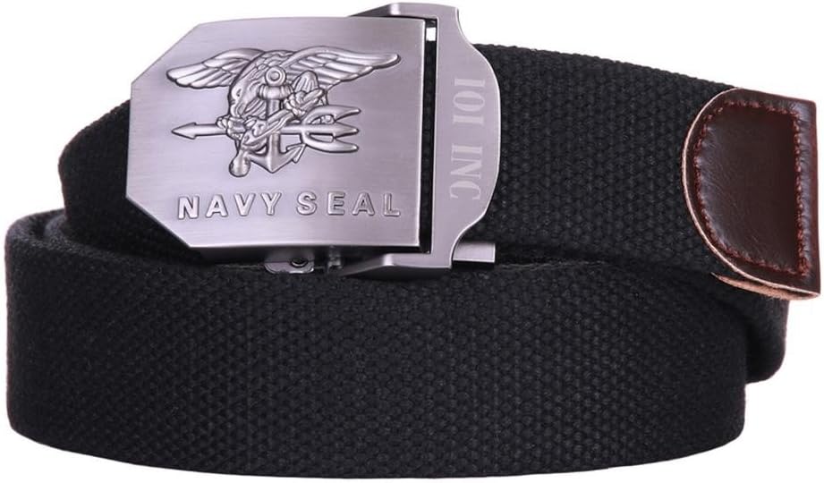 These brand new US Navy Seal belts are made from 100% cotton canvas. Each belt has a metal buckles featuring the US Navy Seal insignia. The threading end of the belt is capped with a smart leather tap. The belts are 3.5 cm wide. The Medium has a maximum length of 45 inches (1.15 meters). The Large has a maximum length of 51 inches (1.3 meters).