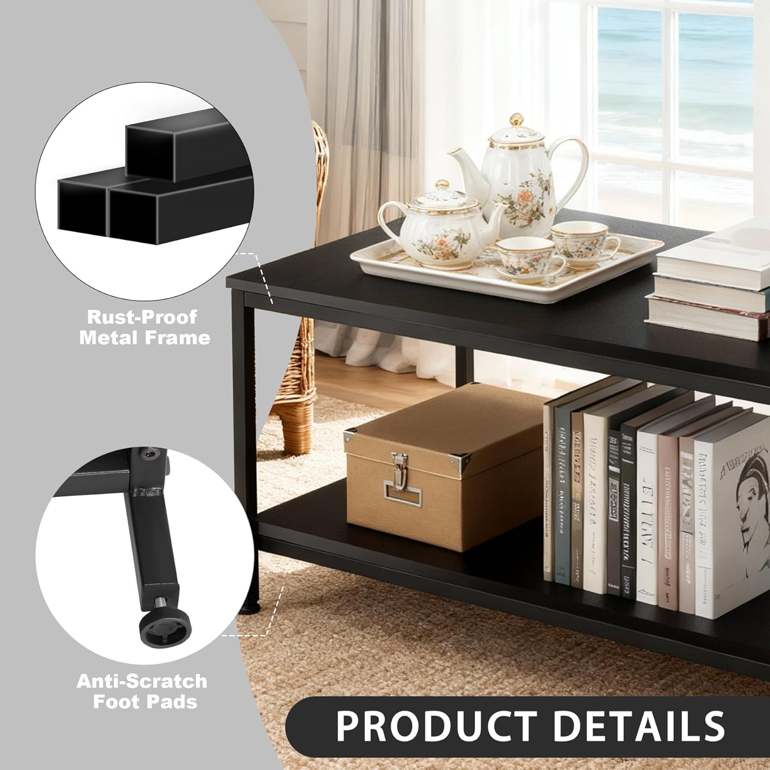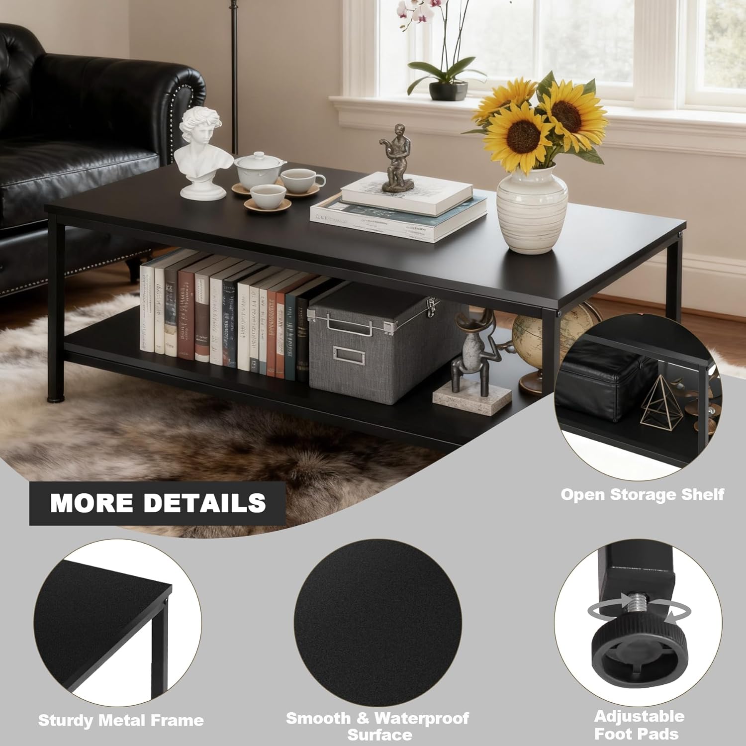 What you will getPlaced in front of your sofa or bed, offers you a enough storage space to display potted plants, books, albums, teacup set and morePerfect table for a dorm or apartment living area, small space, small areas, tiny space. Also can be for kids to use a lego building tablesWe provide lifetime professional customer service, please feel free to contact us if you have any queries no matter before or after-sales, we will reply to you within 24 hoursGet and enjoy this modern coffee table today!SpecificationsColor: BlackShelf Material: MDF BoardFrame Material: MetalNet Weight: 30.97 LBSOverall Dimensions: 39.4”L x 20”W x 16.9”HWeight Capacity: 110 lbs/layerPackage Includes1 x Coffee Table1 x Instruction1 x Accessory Pack