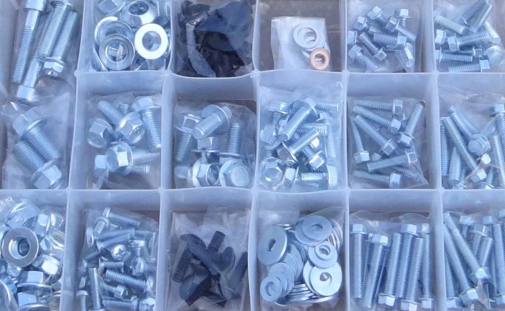 This Specbolt 250 piece kit will save you many trips to the dealership for that special OEM fastener needed for your Suzuki 4 Stroke KingQuad Eiger Quad Runner Ozark Twin Peaks Quad master LT-F500 FX FW ATV. Your Bolt Kit will include just the right amount of factory match flange bolts, flange nuts, lock nuts, sealing washers, fender washers, plastic push rivets, wide head Phillips screws, black truss head screws for fender flairs and mud flaps etc...,and more. Most everything you need to perform basic maintenance and upkeep to your Quad. Assortment of bolts used for plastic, fenders, bodywork, engine, frame, seat, fuel tank, controls, carburetor, exhaust, pipe, silencer, radiators, handlebars, swing-arm components, cotter pins, full set of lug nuts, skid plates, bumpers and more. These fasteners meet or exceed quality standards of your machine's originals. A perfect addition to the racer's tool kit and a must have for the do-it-yourself mechanics. Fits these and more: LT-A KINGQUAD 280 300 400 450 695 700 & 750 cc, EIGER 376 & 400 cc, LT-V700, TWIN PEAKS & LT-F500 FX FW 493cc, LT-V OZARK 246 & 250 cc, QUAD RUNNER 158 160 229 230 246 250 493 & 500 cc, QUAD MASTER 493 & 500 cc, 4X4 AND 4X2 WHEEL DRIVE ATVS
