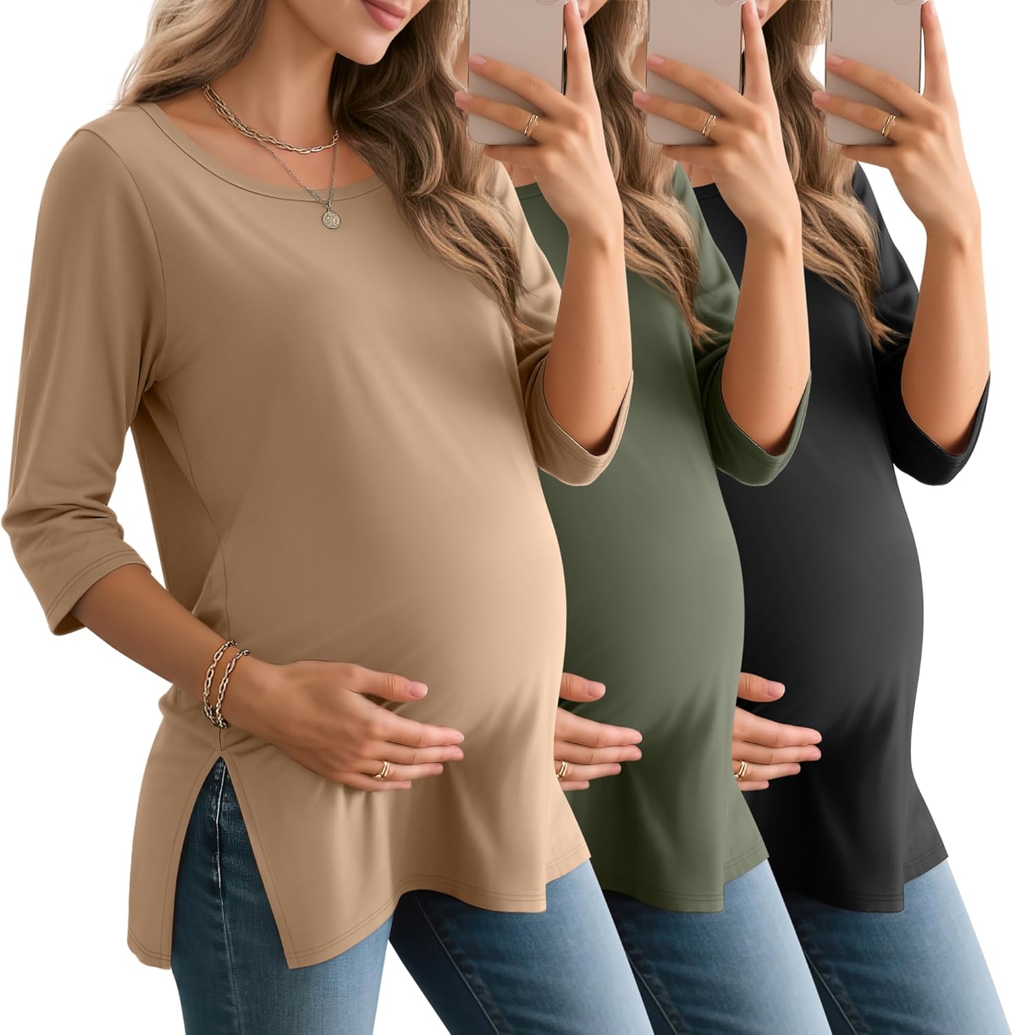 Features: Maternity shirts are your thoughtful present choice, ideal for maternity present Maternity tunics are easy to care for, you can throw them in the washing machine or hand washing, hang them to dry naturally Specifications: Material: 60% Polyester, 35% Cotton, 5% Spandex Package includes: 3 x Maternity shirts Notes: Manual measurement, please allow slight errors on size. The color may exist a slight difference due to different screen displays