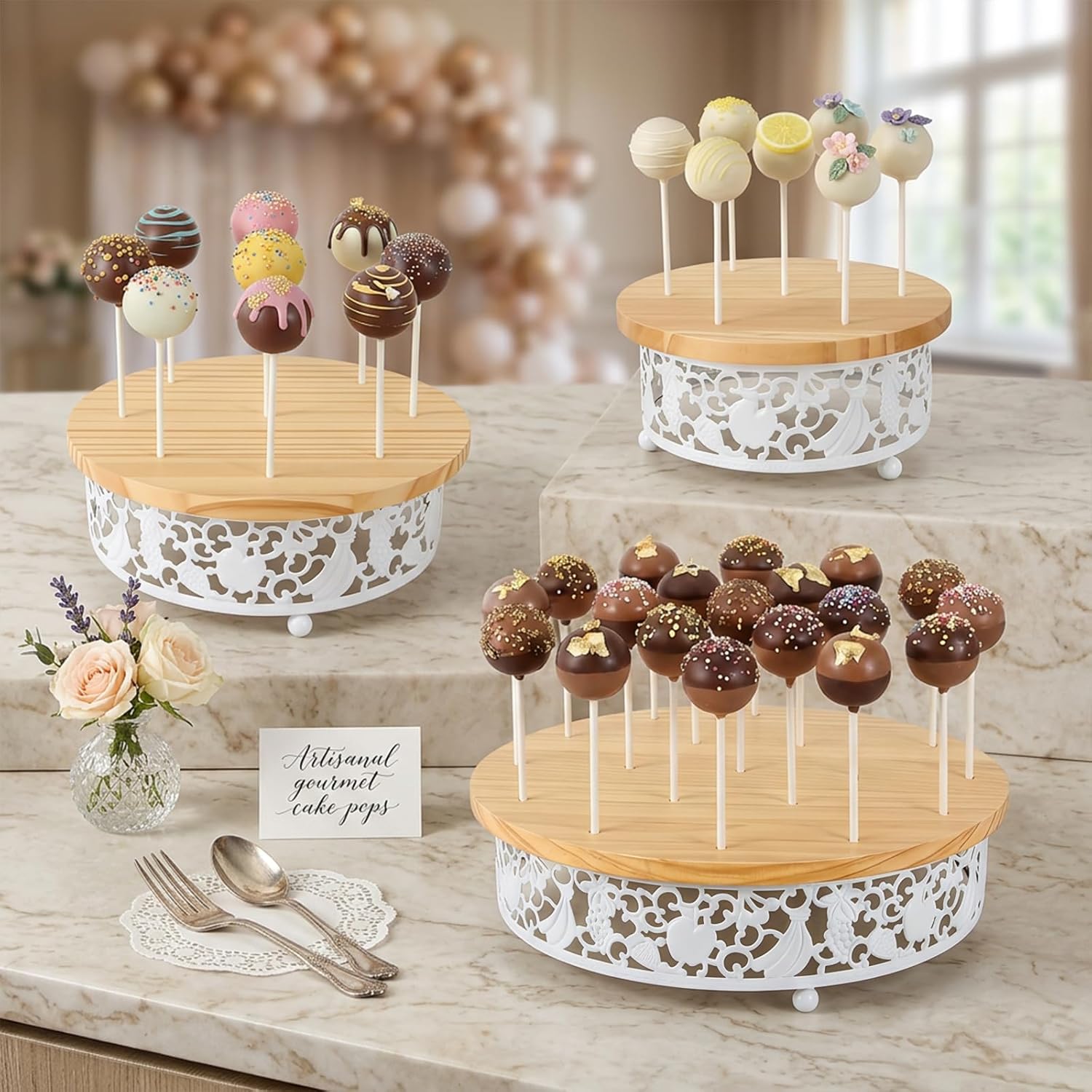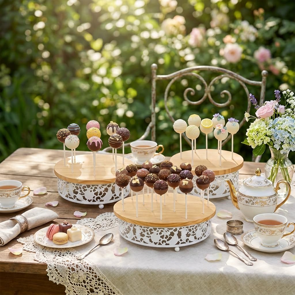 Elevate your dessert presentation with this elegant 3-tier cake pop stand set featuring natural wood platforms and intricate white metal borders. The set includes three circular stands of varying sizes: large (11.8 inches diameter with 19 holes), medium (8.66 inches diameter with 9 holes), and small (7.1 inches diameter with 7 holes). Each stand showcases beautiful laser-cut fruit patterns along the decorative metal edges, adding a touch of sophistication to your display. The stands come pre-assembled for immediate use and include 50 cake pop sticks to get you started. With a total of 35 precisely drilled 0.02-inch holes, this versatile set is perfect for displaying cake pops, cupcakes, or other small desserts at weddings, parties, or special events. The combination of natural wood surfaces and white metal accents creates a timeless look that complements any party theme or decor. The sturdy construction ensures stable presentation, while the matte finish adds a professional touch to your dessert table.