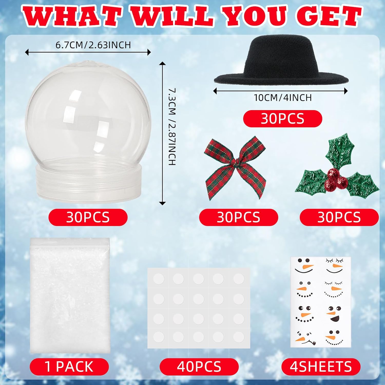 Features: 30 Clear fillable snow globes, 30 mini hats and bows, 4 cute snowman stickers and a packet of faux snow. You can enjoy these stylish winter decorations before and after Christmas Specifications: Material: plastic Color: clear Size: 73mmx57mmx63mm Package includes: 30 Clear fillable snow globes 30 Mini hats and bows 4 cute snowman stickers A packet of faux snow Notes: Manual measurement, please allow slight errors on size. The color may exist a slight difference due to different screen displays
