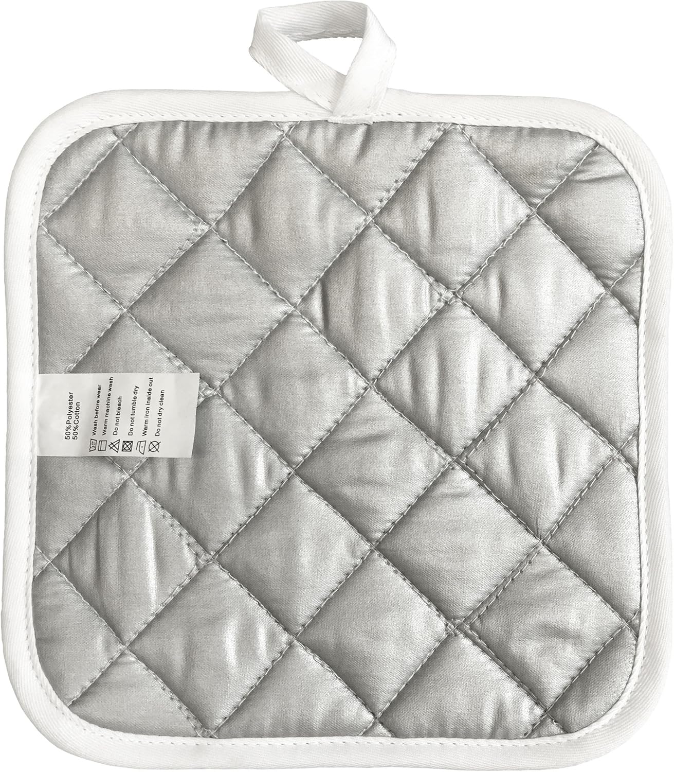 This product is of cotton/polyester blend, pot holder features a quilted design which allows for more flexibility when using. Handy attached loop offers the option to hang for display or storage. Heat resistant for safely removing dishes from the oven and hot pots from the stove. Great as a hostess or housewarming gift.