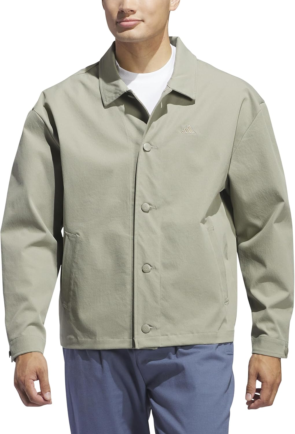 A midweight layer you can wear before, during or after your game, this men's adidas golf coat is the perfect combination of comfort and style. It's made of stretch fabric with a soft cotton handfeel. A full button closure and button cuffs add an elevated touch. A minimum of 70% of this product is a blend of recycled and renewable materials.
