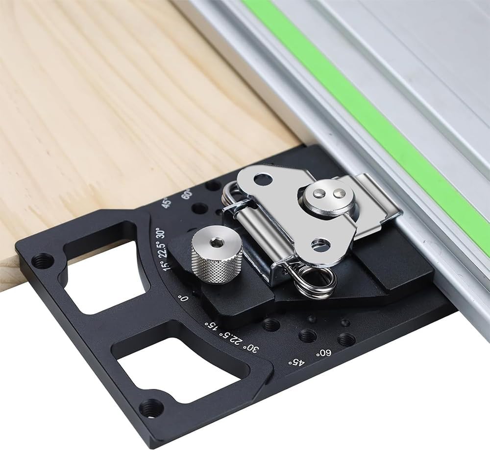 Feature: 【Precision Multi-Angle Cutting】The adjustable angle track saw square is equipped with 11 precision positive angle stops, allowing for quick bevel cuts at angles of 60°, 45°, 30°, 22.5°, 15°, 90°, -15°, -22.5°, -30°, -45°, and -60°. The guide rail square ensures accurate 90-degree right-angle positioning.【Efficient Operation】The protractor square comes with a positive angle stop device, making it easy to achieve precise angle settings. There is no need to mark cutting lines during use, enabling rapid and accurate cuts from 60° to -60°, significantly saving time.【Easy to Use】You can install the guide rail square both in the back and in front of the track saw rail. When in use, simply set the angle, loosen the brass nut, and slide the accessory into the guide rail. Then, tighten the clamp and secure the brass nut to achieve precise angle cuts with the track saw.【Reliable Material】The right angle rail square guide is made of aluminum alloy, balancing weight control with structural demands for daily use. Its compact design makes it easy to carry and store at job sites, and it can be integrated into existing tool systems as a track saw accessory.【Edge Support】The track saw angle guide rail includes a parallel edge support and is compatible with track saw clamps for secure fastening, ensuring more stable and precise cuts.Specification:Name: Guide Rail SquareMaterial: Aluminum AlloyColor: BlackSize: 108.5*280mm / 4.27*11.02inPackage Included:1 * Guide Rail Square