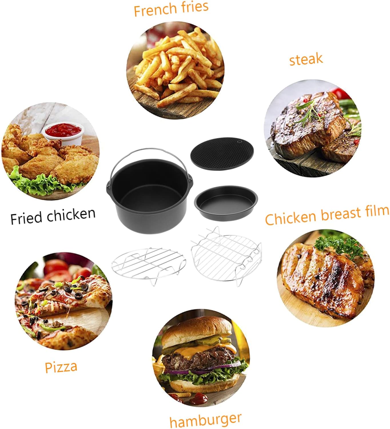 Package List 1 x Pizza Pan 1 x Cake Barrel 1 x Silicone Mat 1 x Holder 1 x Skewers Rack Features -Size: 19.00X18.00X8.00cm/7.47X7.07X3.14inch Air Fryer Kits -Note: Suitable for 7inch air dryer Cake Mold -Color: Black Pizza Baking Tray -Material: Stainless Steel Frying Pot Kit -No oil and butter are required, these help you do the less fat and oil frying food, makes for healthier eating Air Fryer Pan. -The edges are smooth and the bottom is designed with a circular arc, which does not hurt the pot Pizza Pan. -Multiple and various tools allowing you to truly enjoy the cooking with the health advantages and versatility Toast Rack. -The raised basket allows for the heat to reach every angle of the food and gives you the perfect crisp Cake Barrels. -Perfect air fryer accessories for making French fries, chips, , sticks, barbecue Cake Baking Pan.Goods InformationAir Fryer Kits It can be used in the kitchen, or you can take them outside to have a barbecue party.Cake Barrels You should have this set in your home to make delicious food, your family will like it very much.Cake Baking Pan These are practical air fryer accessories, which are specially designed for food frying