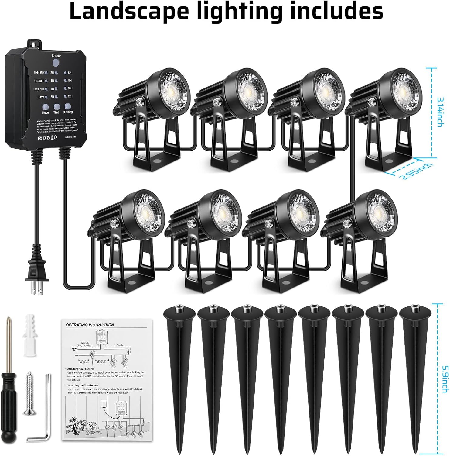 | Included Components | 8 * Landscape spotlight 4 * Metal Stake 4 * Screw 1 * Hex Key 1 * User Manual 1 * Screwdriver 1 * Rubber Expansion Plug 1 * Landscape Transformer UL-Listed Wire |
