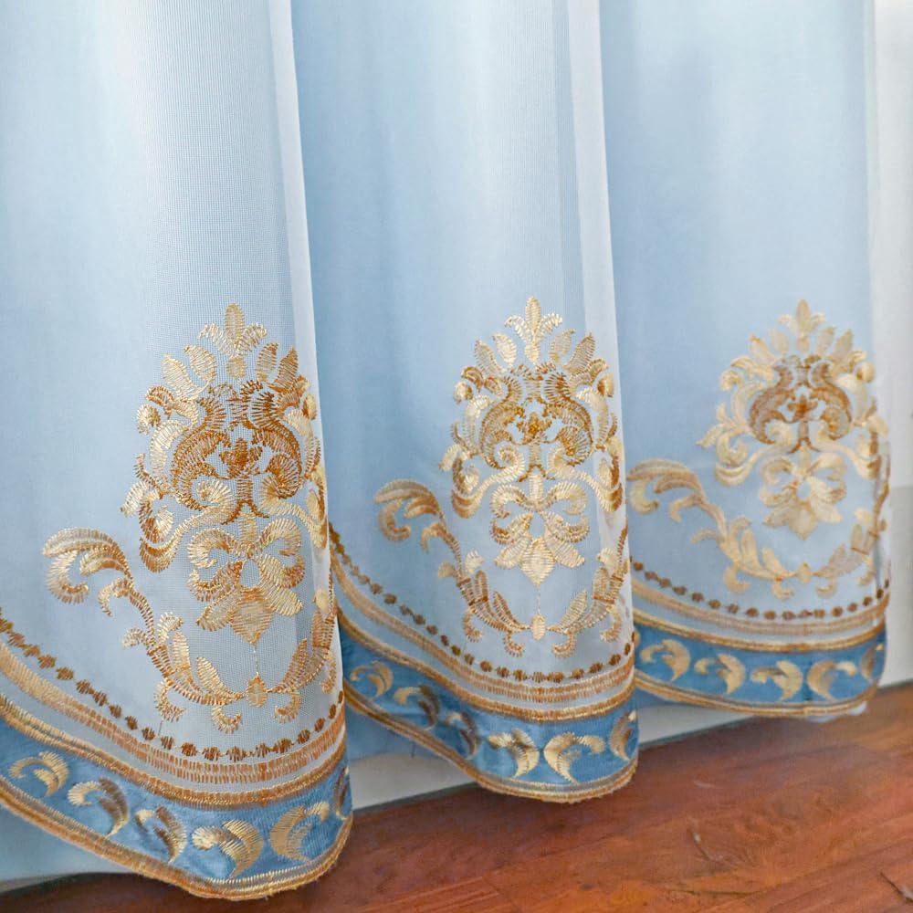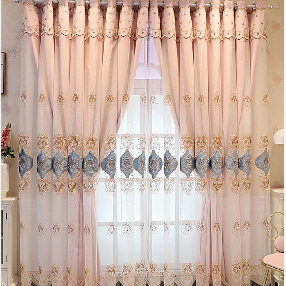 Features: Double layered curtain design, with one layer of solid color fabric curtains and another layer of embroidered sheer curtains, combining shading and aesthetics. The European style embroidery has improved the quality of the product.