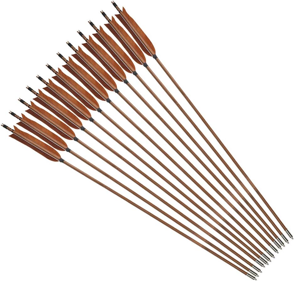 Production Specifications: Diameter: 5/16" Spine: 500 Draw Weight: 40-60lbs Length: 32-Inch/815mm Feather Material: 6.2" real feather fletching vane Tips: Field Points Feather Color: Brown, White Black Shaft Material: Bamboo Arrow Nock: Self nock Features: 1.The arrows have good performance,low hand shock with good speed 2.Fitted for longbow, traditional bow & japanese bow 3.Hunting, archery practice or targeting all can used 4.Good construction offers more durable Package Contents: 12pcs/lot bamboo arrows Note: 1. Please do not shoot at anybody, this is not a toy. 2. Please do not shot againt any hard things, like concrete wall or any hard substances, whick will damage the arrow. Please contact us freely if you have any questions, and we will address the issues for you within 24 hours.