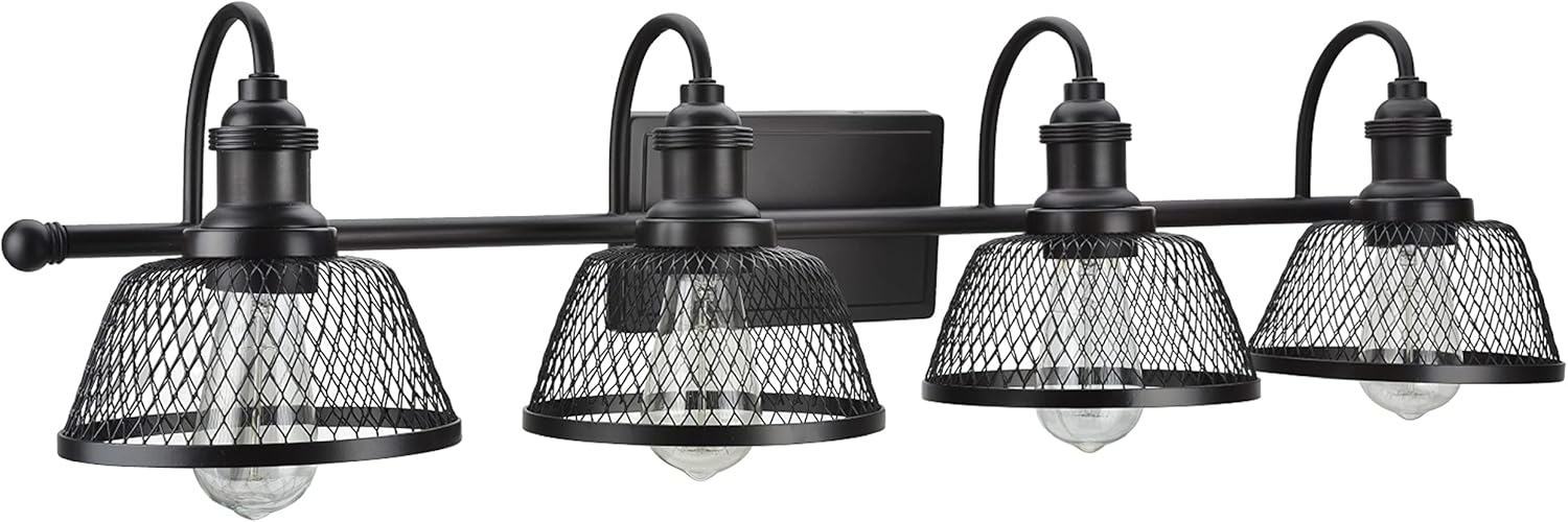 Aspen Creative Item #62096 Aspen Creative offers a four-light vanity that adds a sleek aesthetic appeal to enhance the overall interior design and ambiance. The product features beautiful metal mesh shades with a total fixture size of 8 1/2 inch deep x 34 inch wide x 8 inch height. Experience the versatility of a vanity with the ability to adjust the brightness, creating the perfect lighting conditions for any occasion will be easier than ever due to this products compatibility with dimming technology. Ensuring minimal energy consumption without compromising on performance. Uses four 60 Watt medium base light bulbs (Bulb and Dimmer are not included). Crafted with high-quality materials and attention to detail, our vanity lights will serve as a reliable and long-lasting lighting solution, providing you with years of enjoyment and satisfaction. This transitional vanity light creates an inviting atmosphere and is versatile enough to fit in any space, whether it's above the mirror, vanity cabinet, or even in a dedicated make-up room.