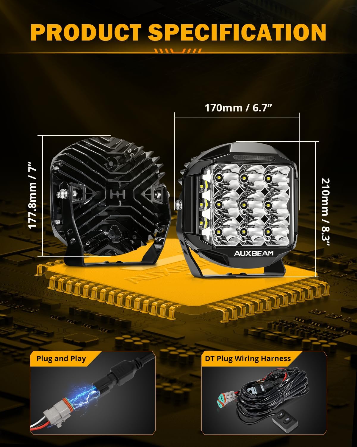 | Included Components | 1 X DT Wiring Harness Kits, 1 X Srew Accessories Kits, 1 X User Manual & Sticker, 2 X 7In Pod Lights & Yellow Covers, 2-Year Warranty & After-Sales Service |