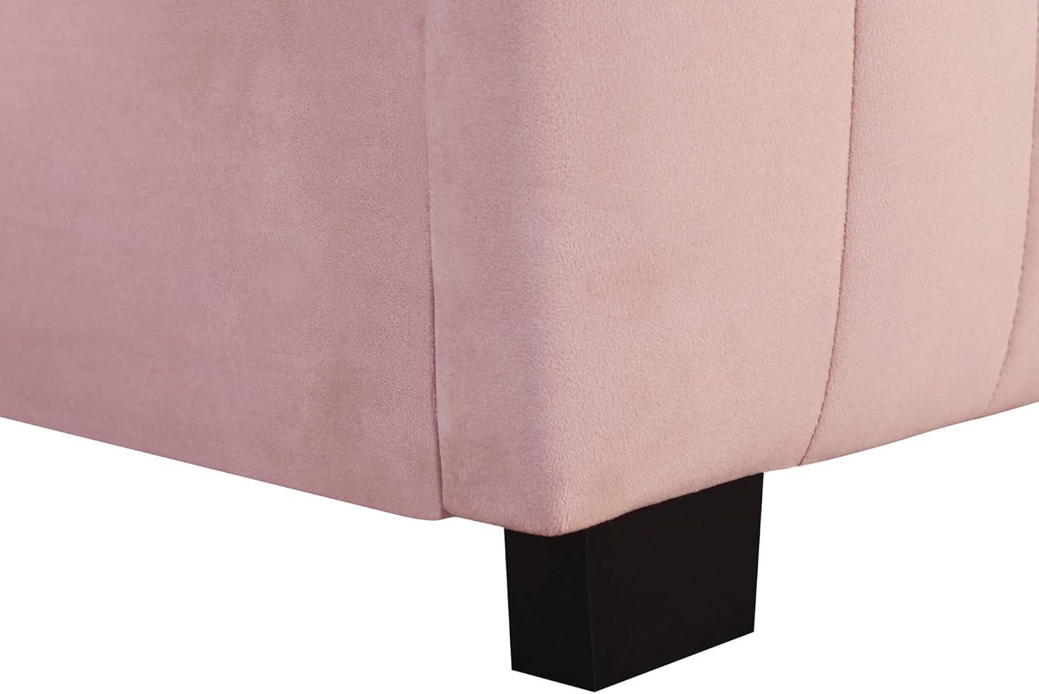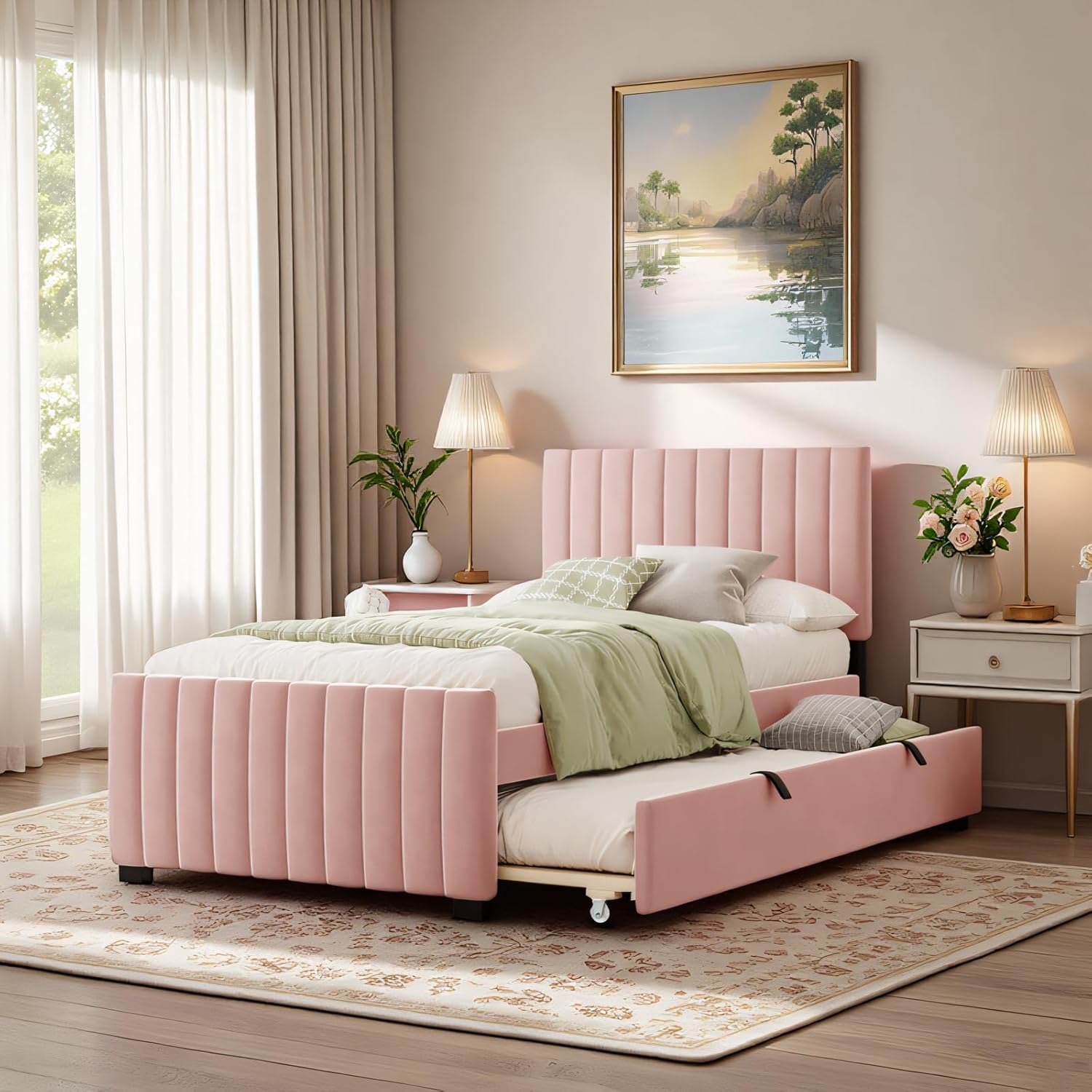 | Item Type Name | Ball & Cast Twin Size Upholstered Platform Bed with Pull Out Trundle,Wooden Bedframe W/ Striped Headboard,Cute Design,No Box Spring Required,Modern Bedroom Furniture for Boys Girls Teens,Pink Velvet |