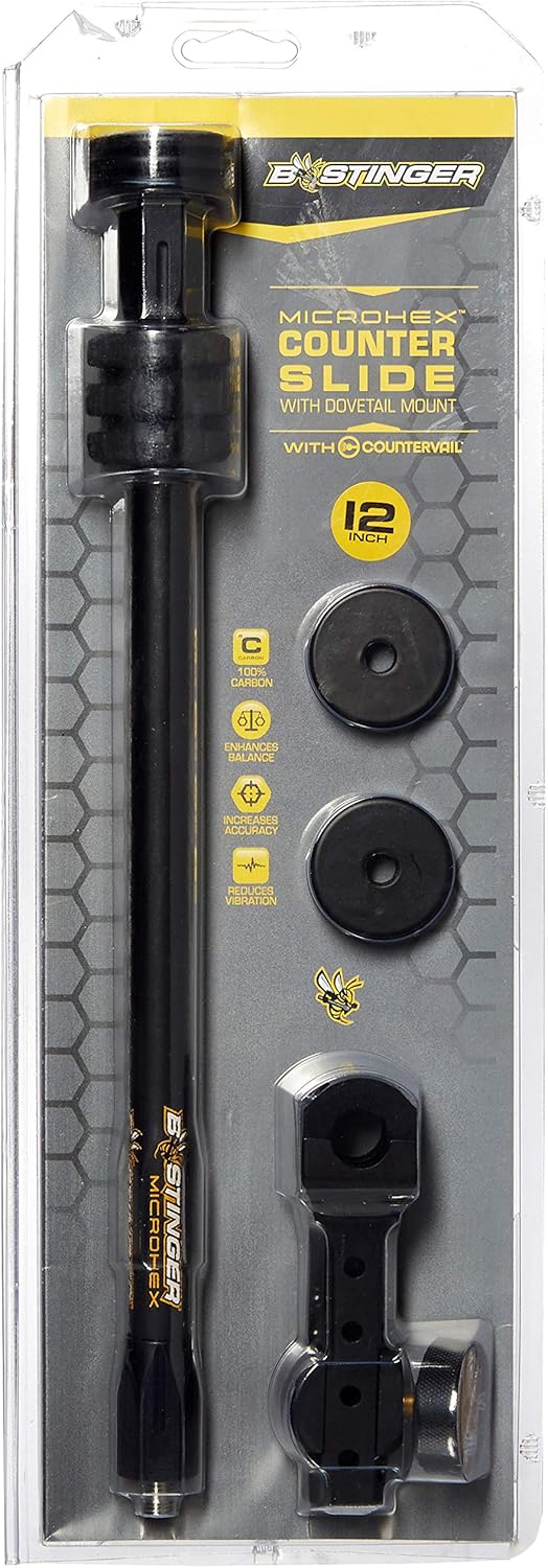 Achieving perfect balance and offsetting the weight of your sight, quiver and other accessories has never been more accurate, adaptable, or simple. The Bee Stinger Counter Slide offers limitless configurations for you to customize the optimal balance for you whether you're hunting or target shooting. Offsets the weight of sight, quiver and other accessories. Allows additional weight distribution both forward and back. Includes 5 individual 1 oz. weights and sliding bracket allow for minute adjustments to achieve perfect balance.