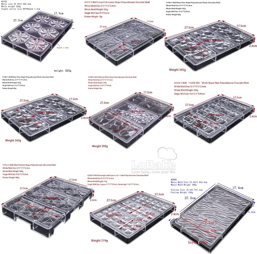 1. #1532 Hexagon Flower Chocolate Mold whole MOLD: 27.5x17.5*2.4cm Weight: 296g Single Cavity Size 8*7*1.3cm 2. #1500 3-Well Different Plate Shape Polycarbonate Chocolate Mold Whole Size 27.5*17.5*2.4cm Whole Weight 399g Single Size 15.4*7.7*0.9cm Praline 90g 3. #1516 3-Well Olive Patttern Shape Polycarbonate Chocolate Mold Whole Mold Size 27.5*17.5*2.4cm Whole Mold Weight 368g Single Well Size 15.8*7.5*0.8cm Praline Weight 100g 4. #1517 9-Well Cocoa Fruit Leaves Shape Polycarbonate Chocolate Mold Whole Mold Size 27.5*17.5*2.4cm Whole Mold Weight 356g Single Well Size 8*4*0.5cm Praline Weight 18g 5. #1574 3-Well “I LOVE YOU”Words Shape Plate Polycarbonate Chocolate Mold Whole Size 27.5*17.5*2.4cm Whole Weight 359g Single Well Size 14.5*6.1*0.95cm Praline Weight 85g 6. #1586 3-Well Water Flow Shape Polycarbonate Plastic Chocolate Mold Whole Size 27.5*17.5*2.4cm Whole Weight 345g Single Well Size 15.2*7*0.83cm Praline Weight 80g 7. #2004 3-Well Diamond Cube Shape Polycarbonate Plastic Chocolate Mold Whole Size 27.5*17.5*2.4cm Whole Weight 366g Single Cavity Size 14.4*7.4*0.95cm Praline Weight 100g 8. #2005 Long Water Ripple shape Chocolate Mold Whole Size 27.5*17.5*2.4cm Whole Weight 366g Single Cavity Size 15.4*7.7*1.1cm Praline Weight 100g 9. #2260 4-Well Rectangle and Square 2 In 1 Cube Polycarbonate Chocolate Mold Whole Size 27.5*17.5*2.4cm Whole Weight 319g Single Well: Square 7.7*7.7*0.9cm, Rectantgle 15.4*7.7*0.9cm Heat resistance -30℃ - +130℃ Materials: High quality Food Grade Polycarbonate Plastic