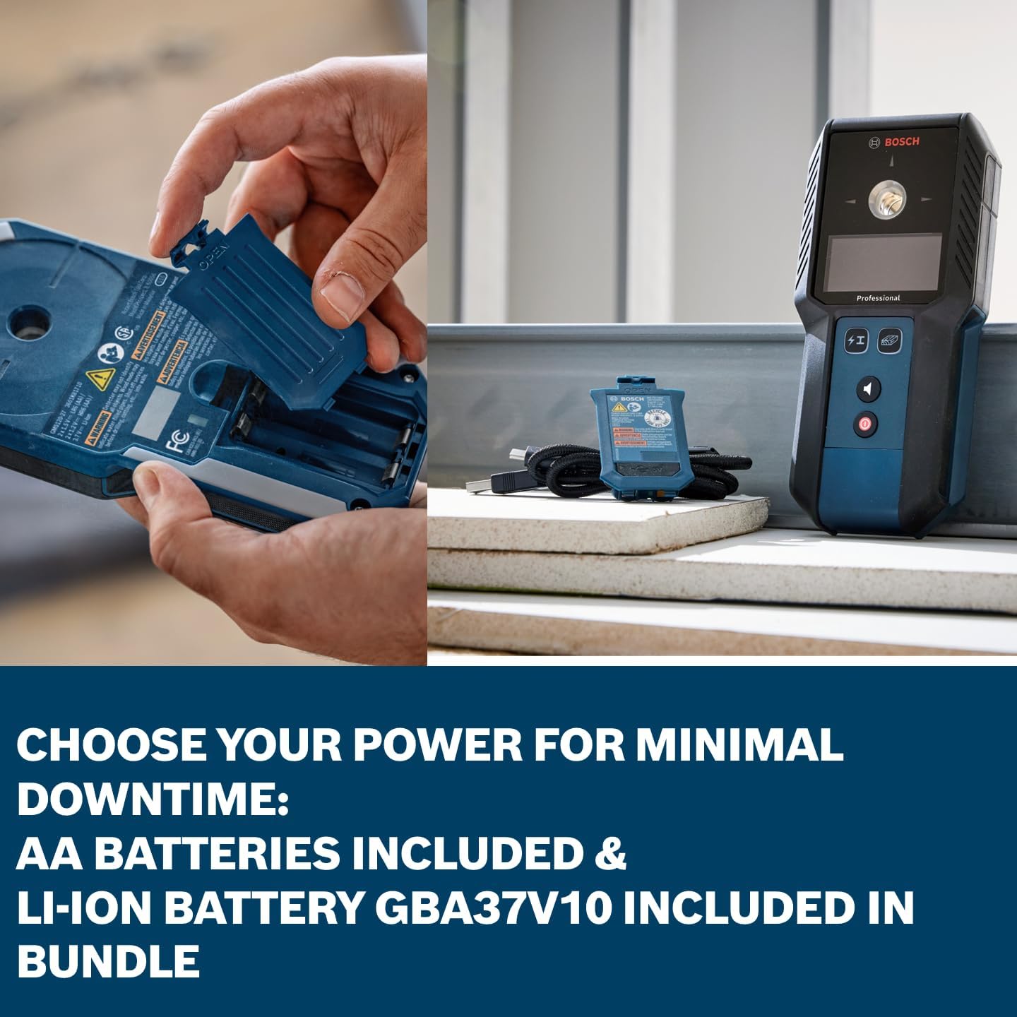 This Bosch bundle provides the ultimate solution for wall scanning and power versatility. The Bosch GMS120-27 Wall Scanner offers quick, easy, and accurate detection of wood studs, steel studs, metals, and live wires behind drywall. With its intuitive user interface, you get clear and confident results, including object center indication and material identification. The color-coded illuminated marking ring ensures fast, accurate work of transferring detection results. This wall scanner is built for tough jobsites with its IP54 rating and shock-absorbing rubber casing for added durability. The GMS120-27 offers Power flexibility, which helps keep it up and running on the job. You can use it with the included two AA batteries or the Bosch GBA37V10 3.7V Lithium-ion Battery pack included in this bundle. The Bosch GBA37V10 3.7V Lithium-ion Battery provides a continuous power supply for longer tasks. It features a convenient USB-C® connector for flexible charging. Use various 5V power supplies, such as power adapters, PCs, laptops, or portable power banks to get it running. Designed to be used with certain BLAZE™ Laser Measures and providing an alternative to using AA batteries. This battery provides continuous charging and can remain in the laser and used while charging. This bundle includes the GMS120-27 Wall Scanner, two AA batteries, a pouch, the GBA37V10 Battery, and a USB-A to USB-C cable. Bosch measuring and layout tools are covered by a one-year limited warranty with an additional year when you register your tool within eight weeks of purchase - for details, visit the Bosch tools website.