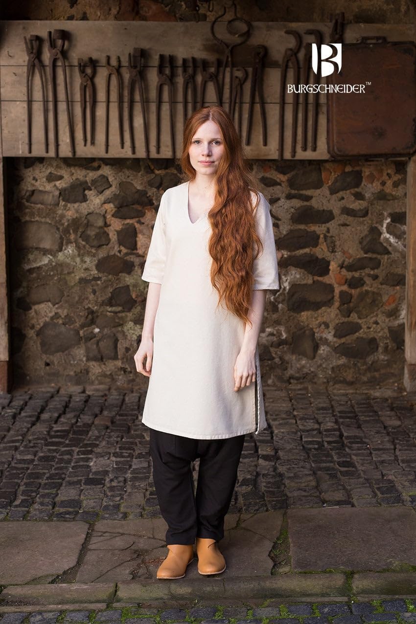 Our Under Tunic Lagertha for Viking women comes with short sleeves. A shield-maiden needs a proper undergarment, so that the beautiful over tunic does not get unnecessarily sweaty. The under tunic is quite long, but has generous slits on both sides to increase freedom of movement. A true shield-maiden must be able to move, after all.While the shield-maiden is more of a fantasy, today it can be portrayed without any problems. All you need is a pair of pants with winingas, this simple under-tunic with a V-neck under a matching over-tunic and some more accessories according to your taste. Like Lagertha, who is mentioned in the ninth book of the Gesta Danorum by Saxo Grammaticus, you will become a warrior in no time with this tunic.