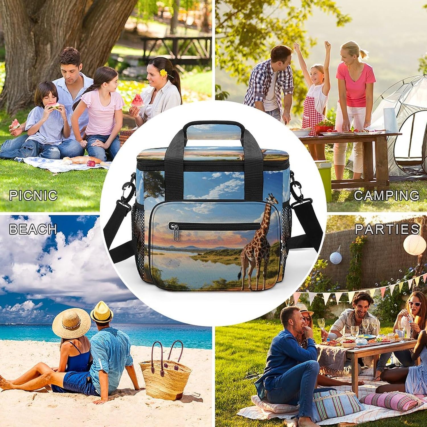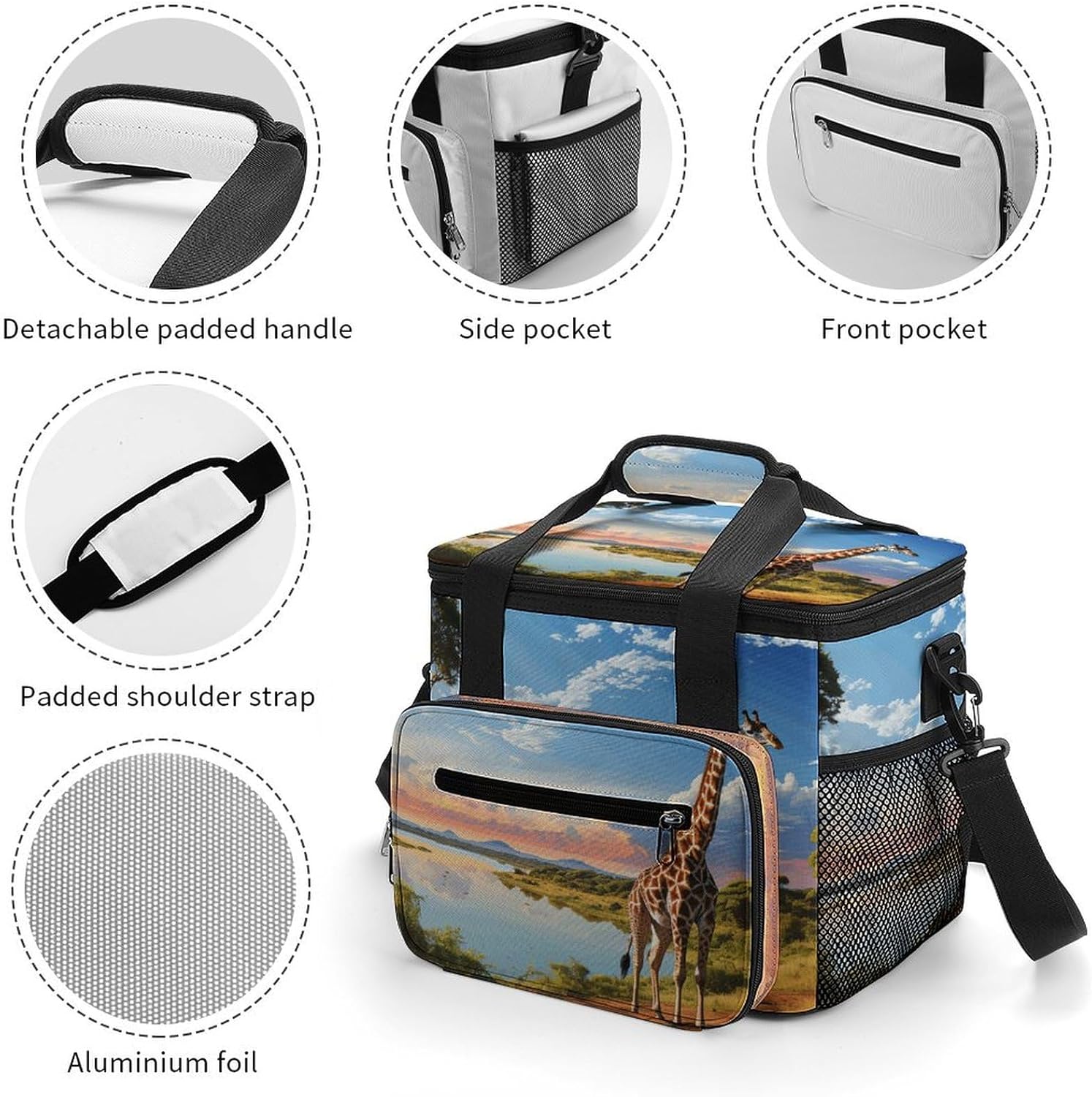 Versatile design: The African Landscape with Nile River And Giraffe print travel cooler bag stylish, gender-neutral design is suitable for all ages and occasions, whether for work, gym, outdoor events, or travel.Perfect for every occasion: This insulated food bag is not just for camping, rugged cooler bag is an excellent choice for everyday use, such as meal prep, lunch at work, grocery shopping, and more.Space-Saving design: The stand-up structure of the outdoor lifestyle bag saves space and makes it easy to store when not in use, insulated grocery bag perfect for compact packing.Machine washable: The reusable lunch bag is easy to maintain, food organizer bag is washable, but avoid prolonged soaking or bleaching to preserve its quality.