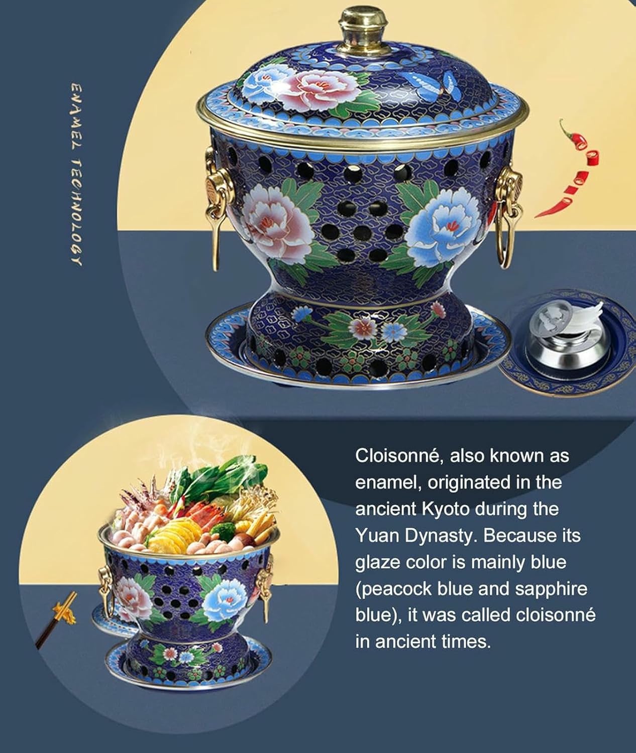 ★ About the traditional Chinese hot pot:It is called the hot hot pot of Beijing or Chinese hot pot.This is the traditional culture and art of China.It can be seen among the Chinese.The lower part of the traditional hot pot is burned with coal and heats up the original flavor of the food.Now enjoy the traditional Chinese flavor with your family and friends.★ Product name: cloisonne cup enamel alcohol pot★ Material process: pure handmade copper.★ Applicable number: 1-2 people.★ Heating method: liquid alcohol, environmental respectful oil.★ Adequate scene: hotel, bedroom, home, etc.