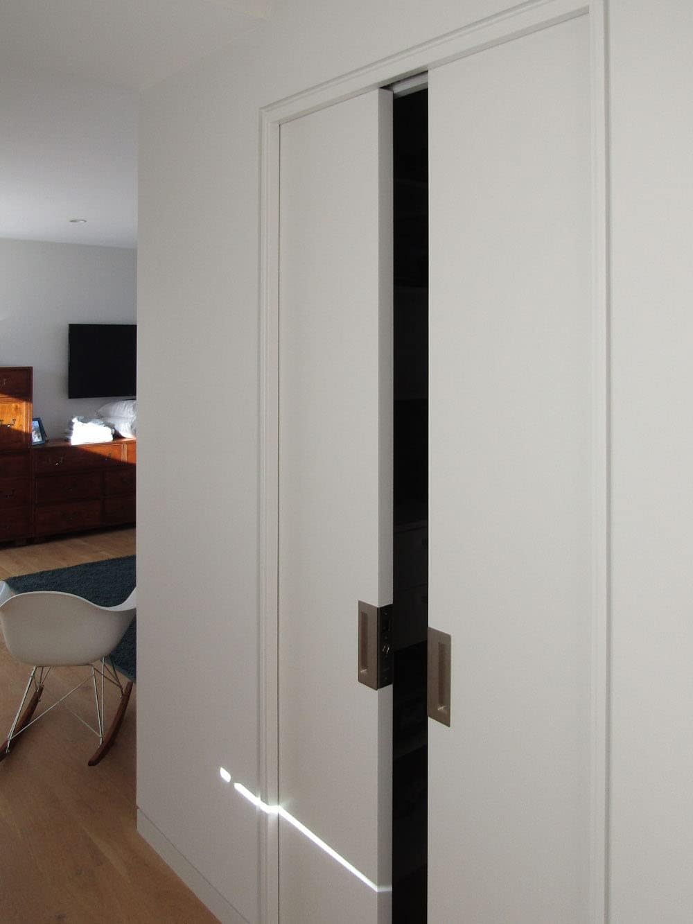 Features: Solid brass faceplate ensures a stronger, more substantial product, limiting wear and resistant to corrosion Reversible handing allows for installation on both right and left handed doors Included step by step instructions accompanied with detailed diagrams and templates make installation a breeze Plunger action magnetic latch - door jamb striker included Magnetic latch sits flush until the door closes, minimizing wear One year manufacturer warranty Integrated finger hole allows for easy retrieval of the door when fully retracted into the wall This particular model comes with a passage function pocket door pull and one passage pocket door pull with a built-in strike plate for a double door configuration Key Product Attributes: Pocket Door Passage Function: Cavity Sliders' passage pocket door pulls have no locking function and are perfect for sliding doors where no locking is required. Plunger Action Magnetic Latch: This innovative technology utilizes magnetism by incorporating a powerful neodymium magnet into the strike plate which pulls a plunger from the body of the pocket pull when the door is closed. This patented plunger action magnetic latch prevents roll back and ensures your door stays in place with a positive hold. Specifications: Door thickness: 1-3/4" Height: 7-1/8" Handing: Left, Right, Reversible Cutout Depth: 2-7/32" Minimum Cutout Height: 5-7/8" Material: Brass, Zinc