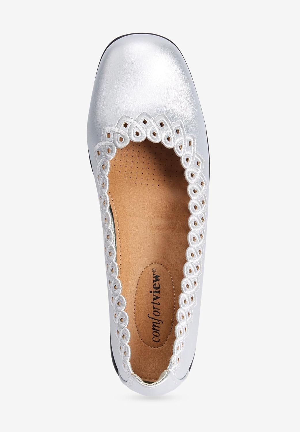 Pretty laser-cut details add a lace-like look to this flex-sole flat. Pair them with skinny pants for a chic look; with suits and skirts for wear-to-work style. Leather-like upperbr>Laser-cut detailbr>Grooved bottom for extra grip and flexibilitybr>1" heel Full and half sizes 7-11, 12 M, W, WW