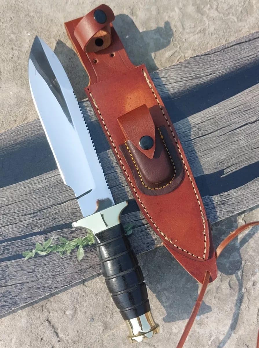 Elevate your outdoor adventures with this custom handmade Bowie knife. Crafted with meticulous attention to detail, this fixed blade knife features a razor-sharp D2 steel blade that can handle any challenge. The stacked leather handle offers a secure and comfortable grip, while the premium leather sheath ensures safe transport and protection. Whether you're hunting, camping, or simply exploring the great outdoors, this knife is an essential companion. Its rugged design and exceptional craftsmanship make it the perfect gift for any outdoor enthusiast. Embrace the thrill of the wilderness with this reliable and versatile knife.