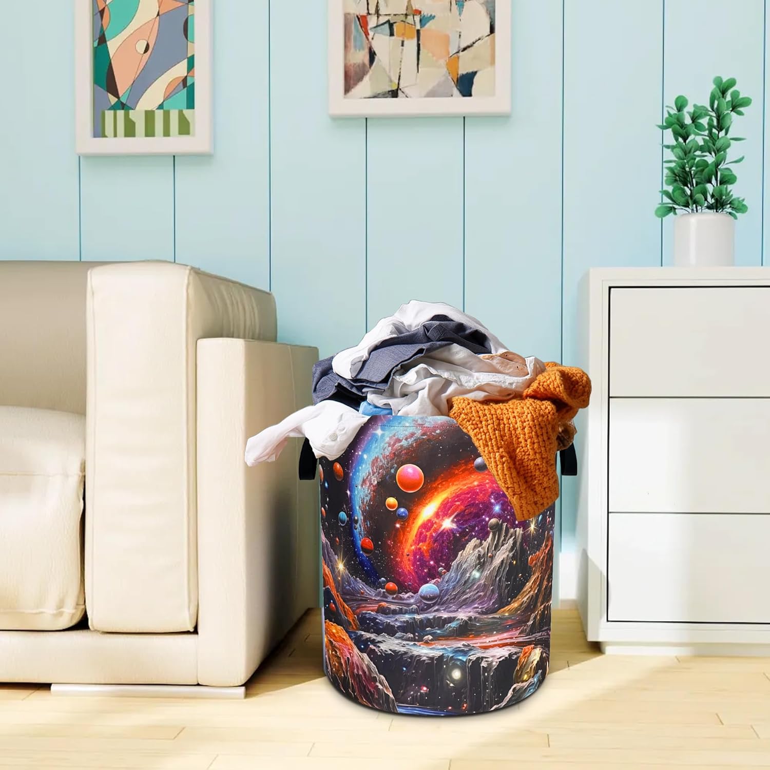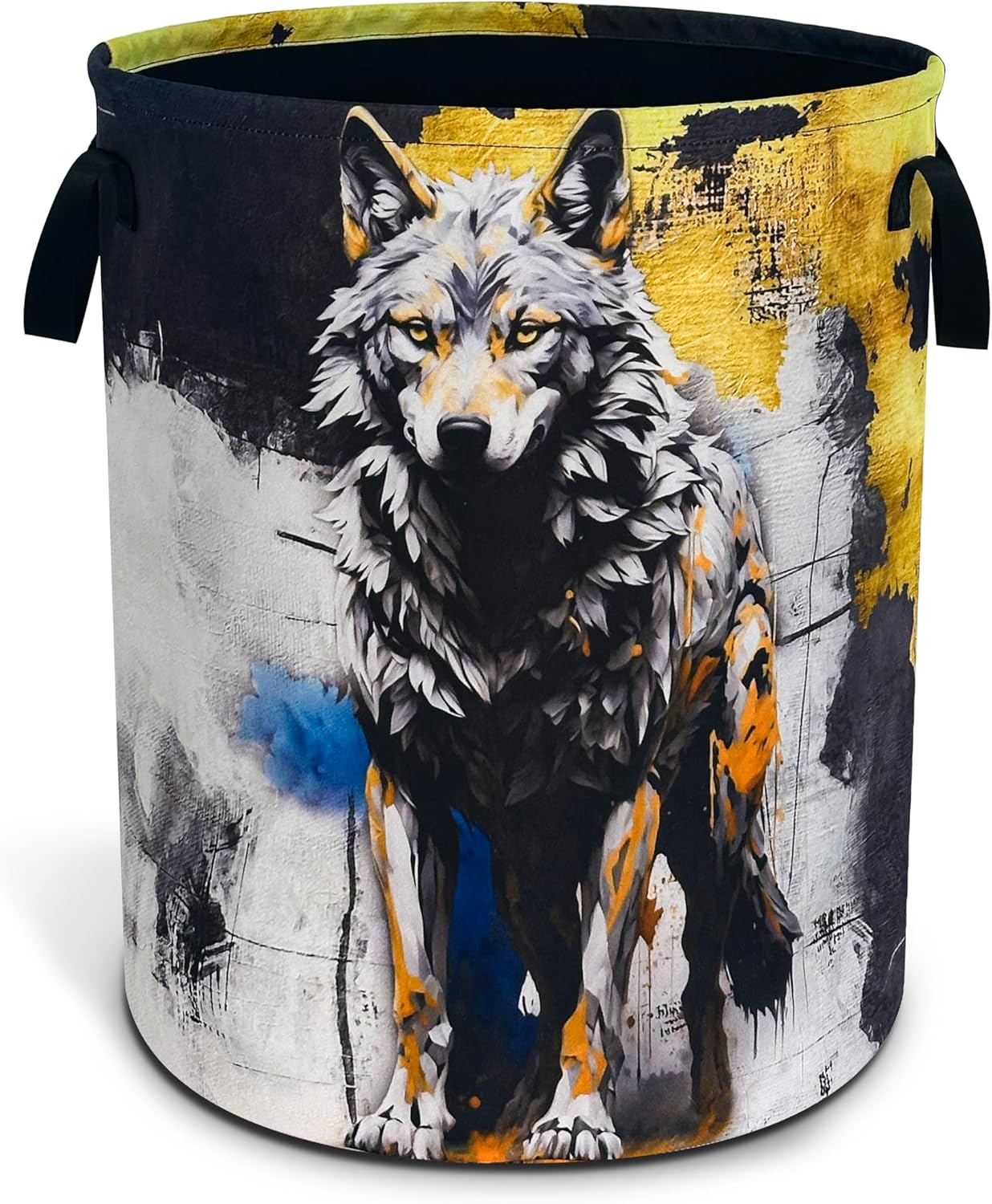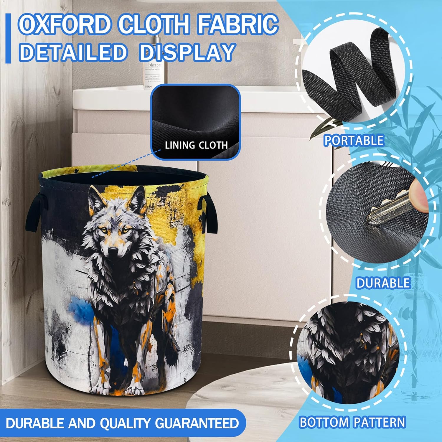 OXFORD CLOTH FABRIC: Lined, lightweight and portable, the material easy to clean, just wipe with a damp cloth or hand wash as needed.COMFORTABLE REINFORCED HANDLE: easy to grip, easy to carry, and more durable.LARGE CAPACITY: size 18.9 inches/48 cm (height) x 16.5 inches/41 cm (diameter). There is enough space to store a lot of clothes and store various items. Add a touch of art and functionality to your home with our eye-catching laundry basket!FOLDABLE: When not in use, our laundry basket can be folded to save space and easy to store, perfect for people with busy lives.WHY CHOOSE OUR LAUNDRY BASKET?Our Laundry Basket Is More Than Just A Storage Solution. It Is A Stylish Piece That Combines Artistic Beauty With Daily Practicality. Make Organization A Breeze!MULTI-PURPOSE BASKET: In addition to laundry, it is also very suitable for storing toys, books, blankets or other items. It has a wide range of uses, keeping your living environment clean, beautiful and tidy. It is a multi-functional product. The artistic design laundry basket is a good choice for bathrooms, bedrooms, laundry rooms, children's rooms, dormitories and other places.