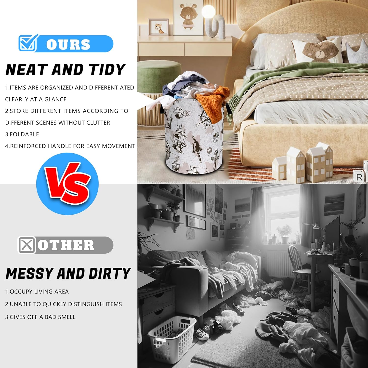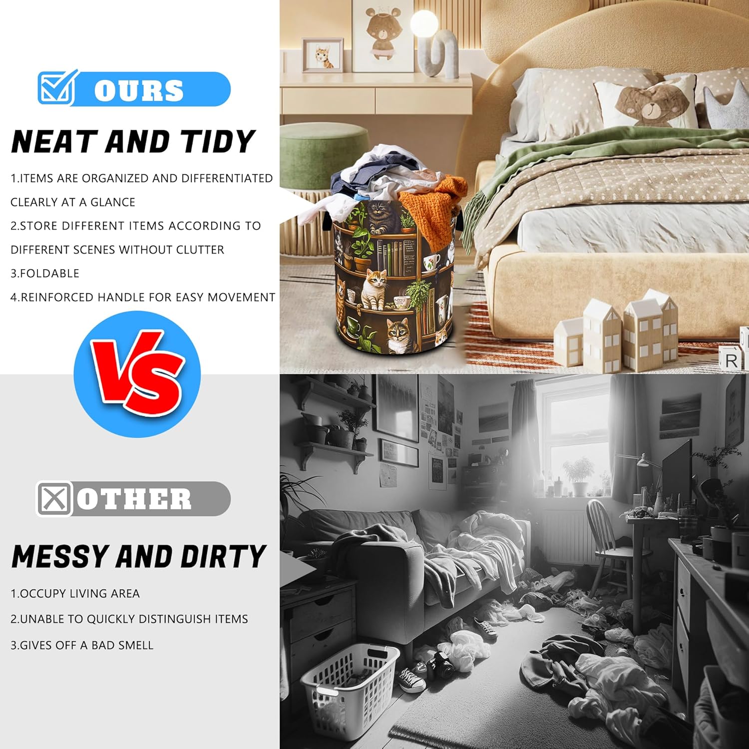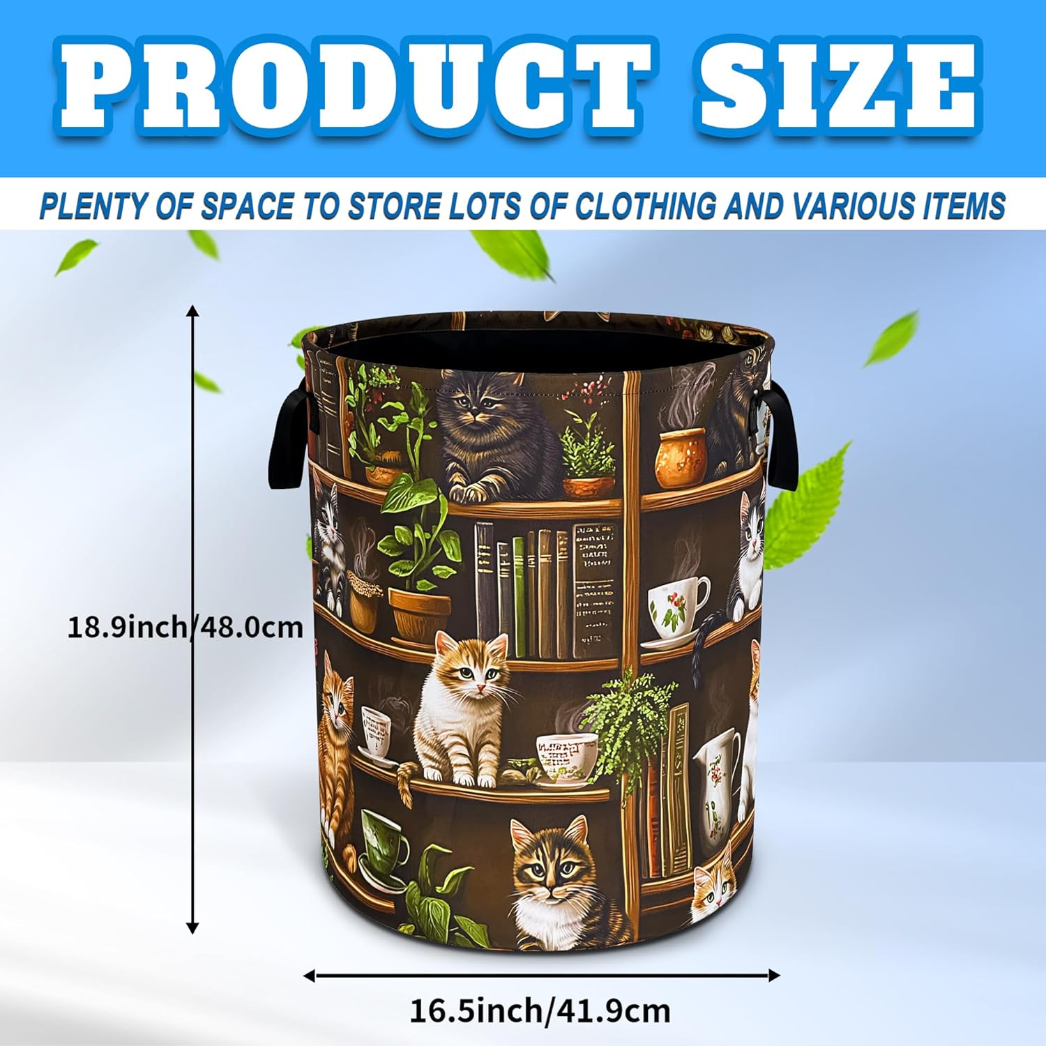 OXFORD CLOTH FABRIC: Lined, lightweight and portable, the material easy to clean, just wipe with a damp cloth or hand wash as needed.COMFORTABLE REINFORCED HANDLE: easy to grip, easy to carry, and more durable.LARGE CAPACITY: size 18.9 inches/48 cm (height) x 16.5 inches/41 cm (diameter). There is enough space to store a lot of clothes and store various items. Add a touch of art and functionality to your home with our eye-catching laundry basket!FOLDABLE: When not in use, our laundry basket can be folded to save space and easy to store, perfect for people with busy lives.WHY CHOOSE OUR LAUNDRY BASKET?Our Laundry Basket Is More Than Just A Storage Solution. It Is A Stylish Piece That Combines Artistic Beauty With Daily Practicality. Make Organization A Breeze!MULTI-PURPOSE BASKET: In addition to laundry, it is also very suitable for storing toys, books, blankets or other items. It has a wide range of uses, keeping your living environment clean, beautiful and tidy. It is a multi-functional product. The artistic design laundry basket is a good choice for bathrooms, bedrooms, laundry rooms, children's rooms, dormitories and other places.