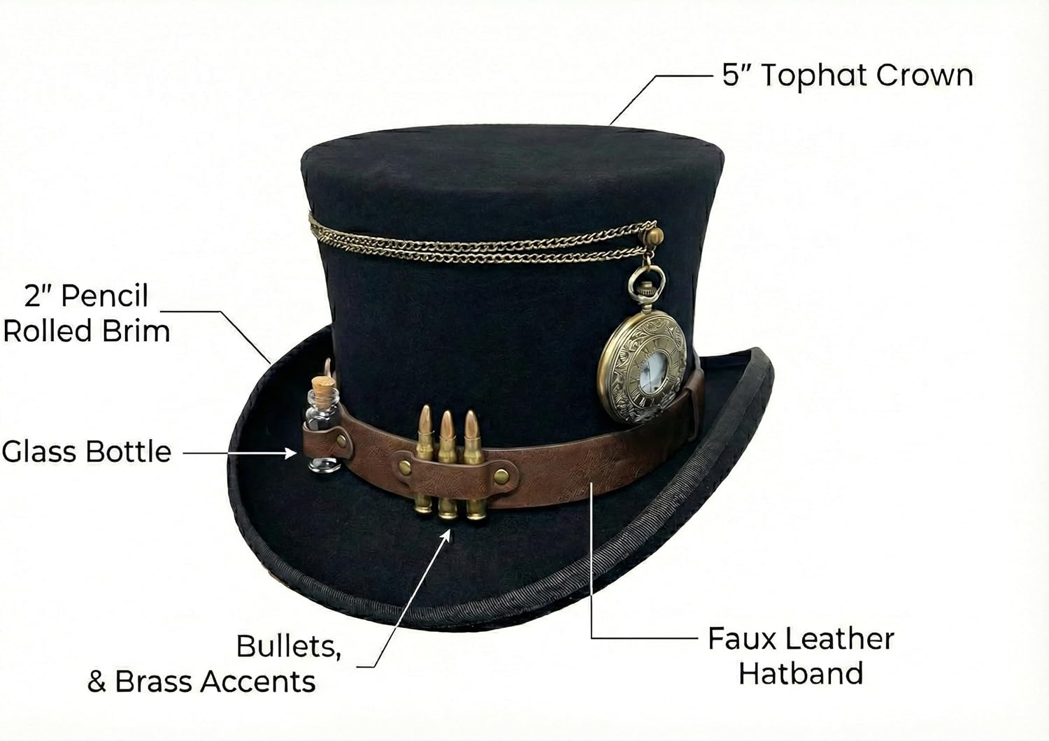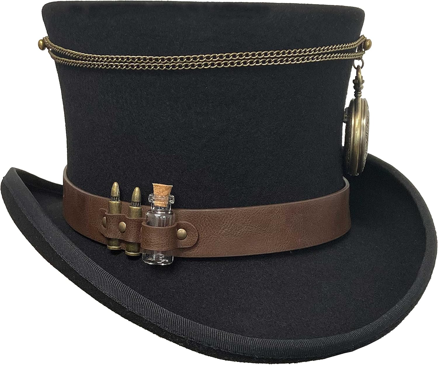 Express your personal style with this whimsical Steampunk top hat by Deadwood Trading. Wild and original; this premium 100% wool felt top hat has a 1" wide brown faux leather hatband accented with a glass bottle, two bullets, and brass accents. A brass pocket watch, is strung across the top of the crown. As an added bonus, the timepiece hands really move! The top hat crown is contoured and measures approximately 5" high and the pencil rolled bound edge brim is about 2" wide.