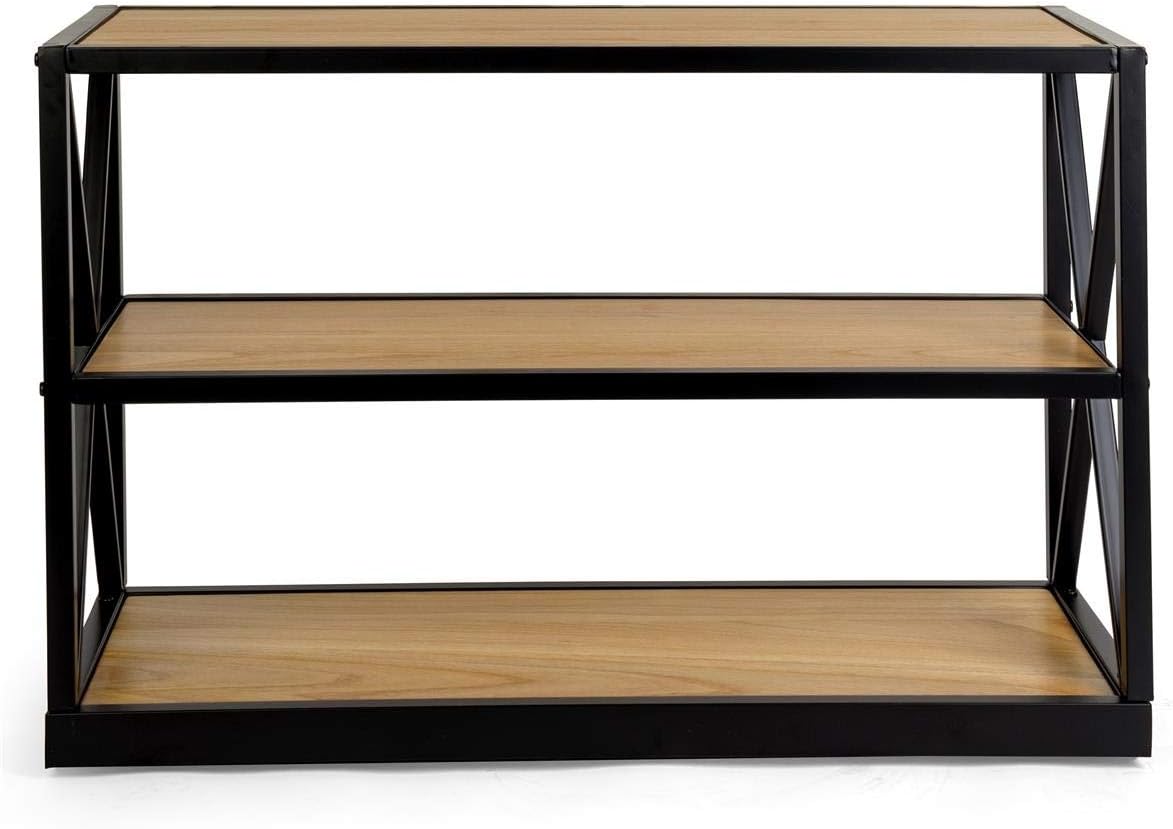 Our wood and steel shelving unit features an industrial design that suits both home and retail decor. Held together with a sturdy X-sided frame with an open back, this comfortably supports up to 220 pounds of storage. The farmhouse-inspired aesthetic makes for an appealing rack in any retail clothing store, cafe, or bookstore. With 3 shelves, this unit stands just over two-feet high and makes for a great accent piece for entertainment centers and businesses alike.