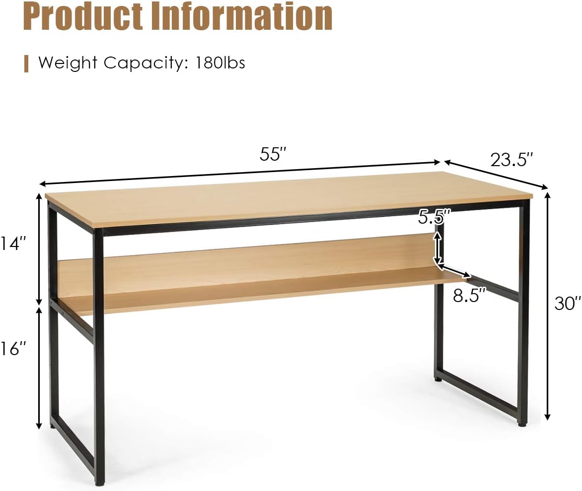 Product DescriptionHigher work efficiency in home may to some extent be based on a comfortable working environment. The computer desk with storage shelf will provide exactly what you need. Measuring 55 inches long, its tabletop perfectly fulfills your working requirement, if you have a desire of keeping a neat surface or accommodating 2 computers. It is also designed with a storage shelf under the tabletop, so as to free up more tabletop surface and thus to expand storage space. In this way, you can get all your mountains of files and books done. Still stand stably even on the uneven ground thanks to the adjustable pads on the bottom. Whether be used as computer desk for gaming, as writing desk for reading or as work table to handle work, the table will be great satisfaction.Features:55 Inch large tabletop helps you keep different kinds of items organizedBookshelf under the tabletop expands the storage space and free up more tabletop surfaceMetal frame for higher sturdiness and load bearing capacityAdjustable foot pads for enhanced stability even on the uneven groundSuitable for study room, home office, serve as computer desk, writing desk, work table etcIndustrial design, match well with different home décorEasy to assembleSpecification:Color: As the picture showsMaterial: P2 Engineered Wood, IronDimension: 55"X23.5"X30"(LXWXH)Net Weight: 43lbsWeight Capacity of Tabletop: 110 lbsWeight Capacity of Storage Shelf: 70 lbs