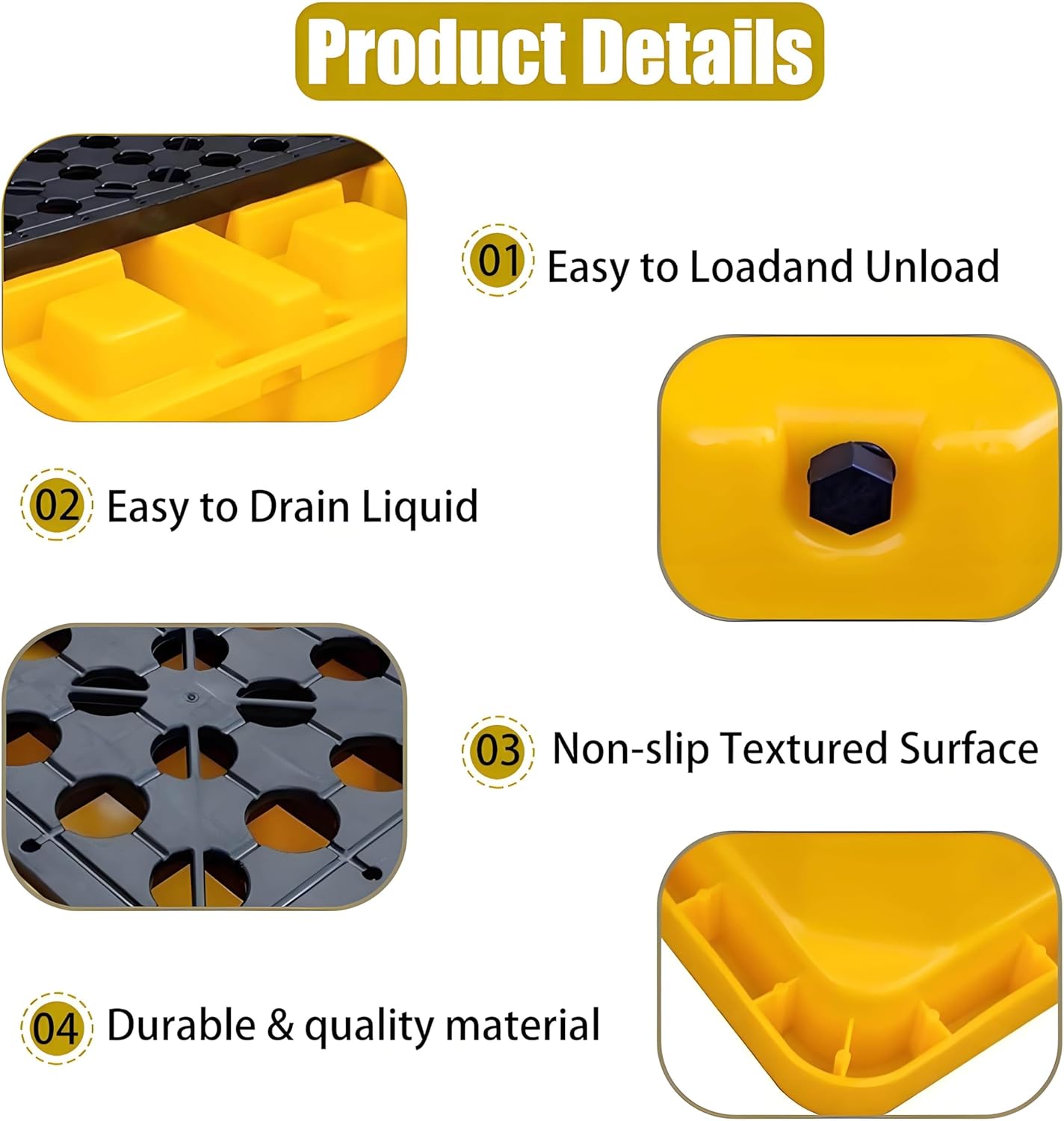 The seamless construction of this spill containment pallet eliminates leaks to protect against unwanted spills and help avoid potential fines while the removable top grate makes cleaning easy.Suitable for various industrial parks, warehouses, aquaculture water storage, and more.▶PRODUCT DETAILSName: Modular Spill Platform/Plastic TrayMaterial: polyethyleneProduct size: Length x Width x ThicknessColor: Yellow+Black(colors are eye catching and not easy to fade)Size: We have 18 sizes for you to choose, please select the size you needFeatures: waterproof, wear-resistant, cold-resistant, strong load-bearingAdditional features: Removable, Flip, Liftable, Storage, Push-Pull, HydraulicLoad capacity: Each size of pallet has a different load capacity, the larger the size the greater the load capacity.▶PACKAGE CONTENTSSpill Containment Platform x 1