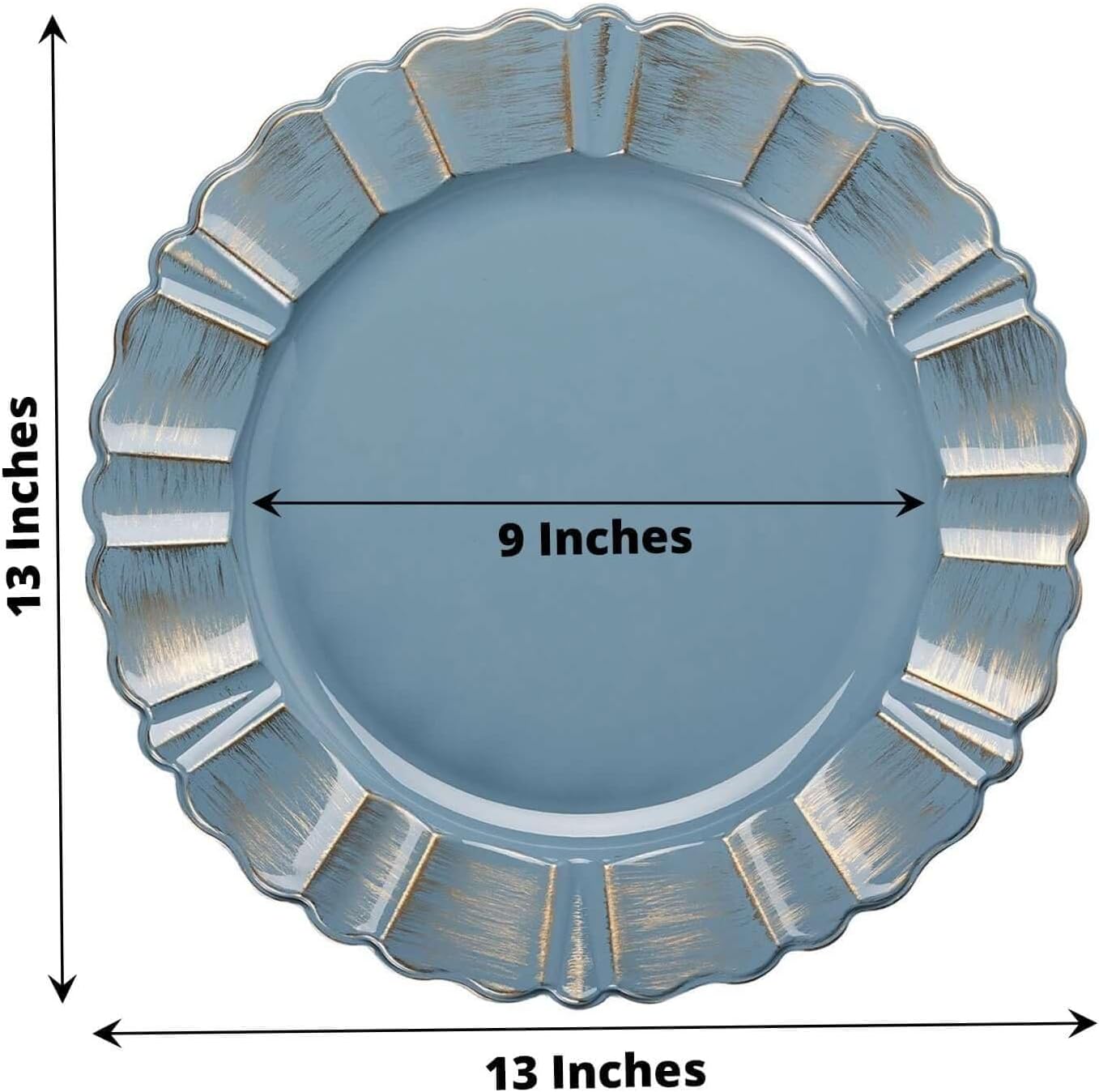 Dusty Blue Round Charger Plates With Gold Brushed Wavy Rim Combining the charismatic charm of solid color boldness with the regal sheen of glistening metal, these chic charger plates are a fab choice to elegantly take the sophistication of your tablescape up by several notches. Featuring premium quality plastic construction in classy round shape with voguish scalloped waved rims accented with modish metallic shades, our charming chargers are perfect for augmenting food presentation at your catered events, culinary functions, outdoor reception, weddings, banquets, and even festive holiday dining. Dusty Blue Acrylic Plastic Charger Plates Artistically crafted from sturdy plastic material, this charger plate is strong enough to withstand possible wear and tear, thus giving you an elegant service plate or under plate to dress up your dining tables time and time again. Upscale waved scalloped rims coupled with classy metallic tint together will impart an imperial accent to your table settings. Dusty Blue Decorative Serving Plates Being 13" in diameter, there is an ample room for serving soups, salads, and entrees. For a truly exotic dining experience, pair these beauties with our baroque metallic shade disposable flatware, dinner plates, bowls, glass, and other sumptuous tableware. Additional Information: Sale is for Charger Plates only, other decorative accessories not included. Easy to wash simply wash under hot rinsing water. These plates are not microwave or dishwasher friendly. Perfect for receptions, banquets, and other formal catered events