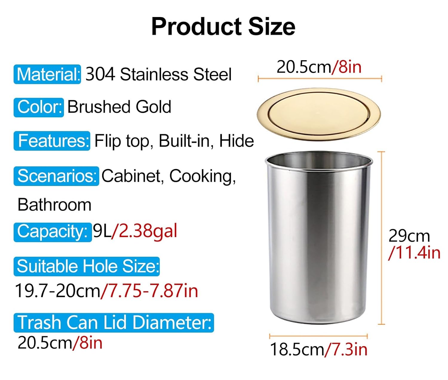 Are you still annoyed by the need to frequently pull out the trash can drawer when disposing of garbage? This built-in trash can lid can be opened by simply pushing either side of the cover, and it closes automatically after you throw away the trash.Are you still anxious about garbage being thrown randomly or unsanitary conditions? The hide built-in trash can lid not only conceals the garbage but also prevents odors, creating a pleasant home environment.FeaturesColor: Gold , Bronze , Copper , Rose Gold , Gunmetal GreyMaterial: Stainless SteelSize: 20.5 cm/8 in (Lid Inner Diameter)Capacity: 9L/2.38gal, 12L/3.2galSuitable for Trash Bin with hole opening: 19.7-20cm/7.75-7.87inProduct Feature:This flexible stainless steel built in trash can with a balanced lid. The central swing allows the lid to be easily opened from both sidesConcealed design not only hides garbage but also prevents odorsSimple shape saves space and makes your kitchen or office look more clean and tidyMade of sturdy and strong stainless steel, which can be , the more you use itIts embedded design saves space efficiently. It hides messy trash under tables and countertops, keeping your kitchen or office clean and organized.Featuring a smooth brushed surface, it is easy to clean. Simply wipe with a damp cloth to keep the surface looking sleek and neat.Package Including:1 x recessed cover with Trash CanTips:Manual measurement products may have dimensions of a few centimeters of difference, please understand.There may be some differences between the image and the product due to display and lighting reasons, please refer to the actual product