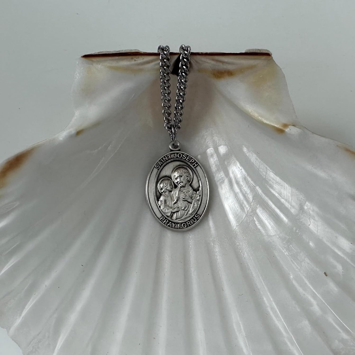 Celebrate the patronage of St. Joseph with this beautifully crafted Sterling Silver St. Joseph Pendant. Measuring 1” x 3/4”, this pendant features a detailed image of St. Joseph, the patron saint of carpenters, fathers, and those preparing for the end of life. Crafted from high-quality sterling silver, the pendant has a sleek, polished finish that highlights its intricate details. It comes with a robust 24” Stainless Silver Heavy Curb Chain, offering durability and a striking look suitable for everyday wear or special occasions. Presented in a deluxe flip-top, gift box, this pendant makes a meaningful gift for anyone seeking the protection and guidance of St. Joseph or a cherished addition to your personal jewelry collection. Its classic design and superior craftsmanship ensure it will be valued for years to come. Key Features: Sterling Silver St. Joseph Pendant: Measures 1” x 3/4” 24” Stainless Silver Heavy Curb Chain Includes Deluxe Flip-top, gift box Detailed Image of St. Joseph, Patron Saint of Carpenters, Fathers, and the Dying High-Quality Sterling Silver for a Polished and Lasting Finish Durable Stainless Silver Chain for a Bold and Elegant Look Ideal Gift for Inspiration, Protection, or Personal Devotion Embrace the spiritual significance of St. Joseph with this elegantly crafted pendant, combining timeless style with profound meaning.