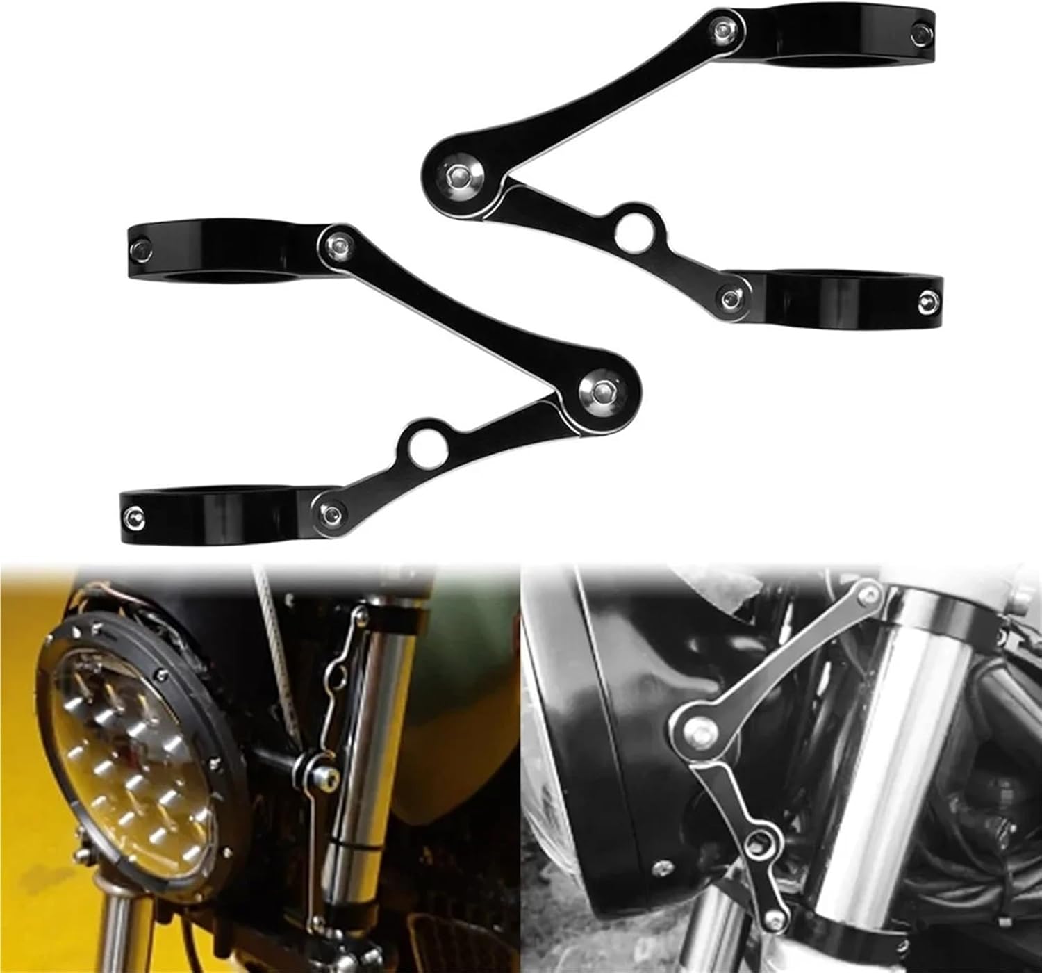 Motorcycle Universal 39mm-41mm Headlight Fork Tube Bracket Mount Clamp Holder Black fit For Harley Cafe Racer Sportster XL fit For HondaFeatures:CNC machined headlight brackets that incorporate fork clamps.With an added advantage of being able to pivot around the fork to allow for headlights with a range of widths.Easy to fit them to your forks without removing the forks from the yokes.Comes with 2 clamps and protective strips, comprehensive kit to relocate your headlight.Suitable for cruisers, cafe racers and so on.Specifications:Material: CNC,AluminumSurface Treatment: OxidizedTechnology: CNC MachinedColor: BlackItem Quantity: 1 PairMounting Hold Diameter: 39mm/1.5in, 41mm/1.6in (optional)Fitment: Universal fit for Harley fit for Honda fit for Kawasaki fit for Suzuki fit for Yamaha fit for BSA Models with 39mm/41mm(optional) diameter fork tubePackage List:1 x Pair of Headlight Mount Bracket With four washers.