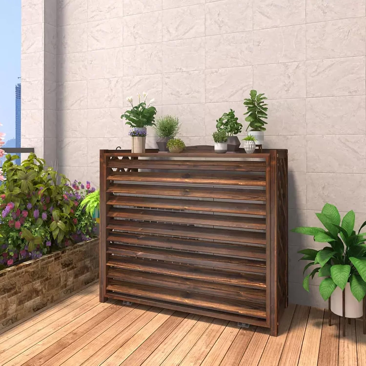 Name: Outdoor air conditioner wooden cover with flower stand Applicable scenarios: garden air conditioners, various external equipment, trash cans, etc. Function: heat dissipation, ventilation, dustproof, decoration, privacy screen. This wooden air conditioner cover integrates heat dissipation, ventilation, and dustproofing. It not only provides protection for garden air conditioners, but can also be used for various external equipment and trash cans. Its careful design is both practical and beautiful, and the wood grain decoration gives the environment a natural feel, while acting as a privacy screen to create a quiet and private atmosphere for the space. Whether you purchase this item or not, thank you very much for visiting our store. If you have items you like, you can add them to your cart or keep them in your collection. When you need to purchase in the future, you can always come to our store to have a look. Kind tips: Please allow 1-2cm differences due to manual measurement. Due to factors such as light and display, there may be some differences between the actual product received and the picture. Please refer to the actual product.