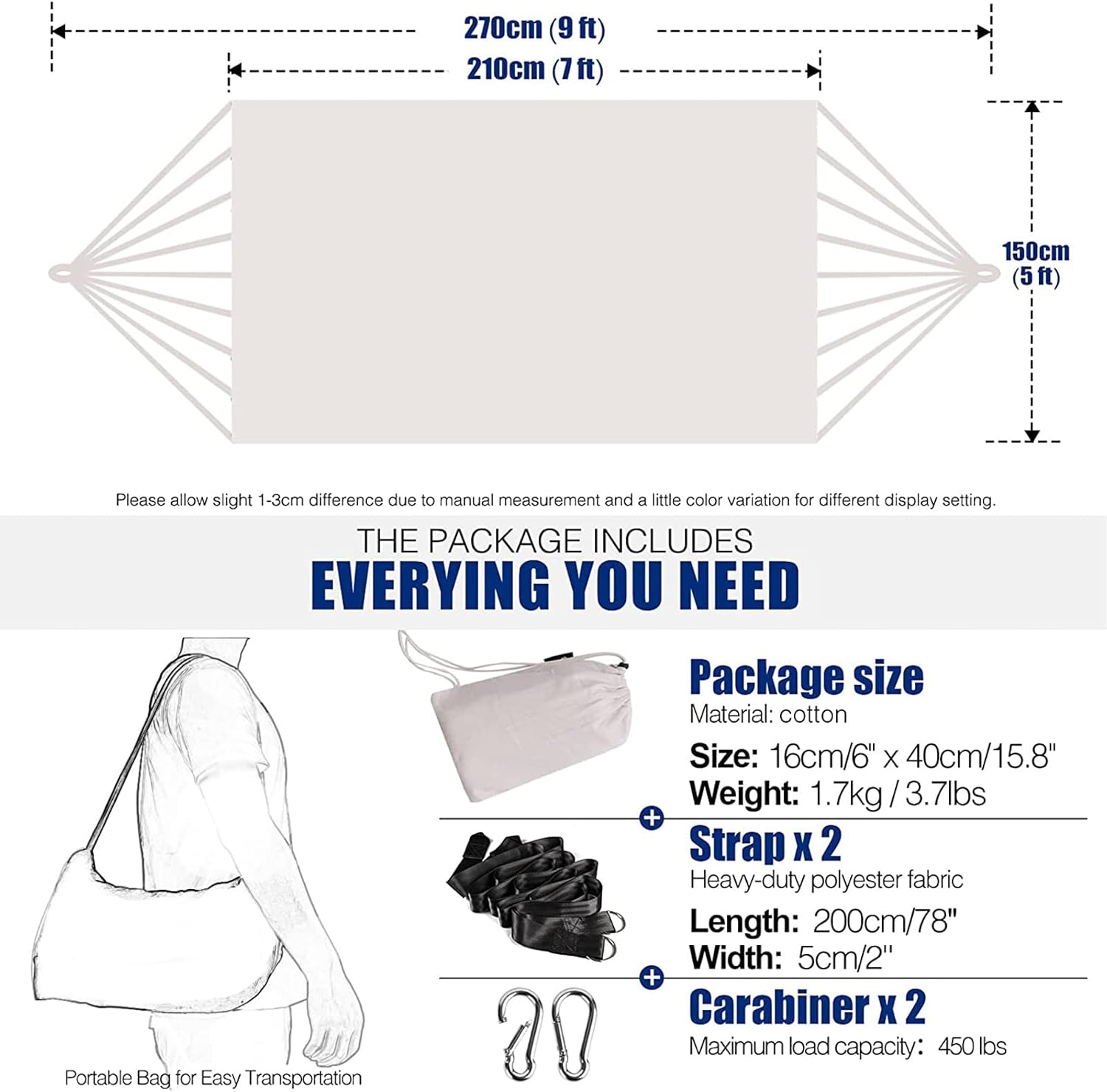 Portable Bag for Easy TransportationLeave the drawstring bag in the backyard, cottage or hang it on the porch. You can take it for camping or take it anywhere indoor / outdoor.Unique Fishtail Weaving DesignThe traditional hand-knitted fishtail knot makes the rope more evenly stressed and stronger weight bearing capacity.Strong Straps & Steel Carabiners2 x High-density nylon straps2 x Strong steel carabiners.Each belt is 6.5ft long,2 inches wideindoor hammockoutdoor hammockhammocks for outside
