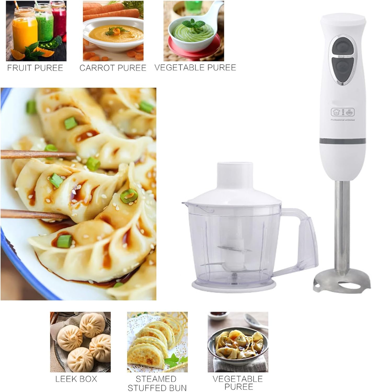- 1 x immersion blender- 1 x chopper with lid- 1 x measuring jar- 1 x egg whisk- 1 x instruction manualIdeal for serving 4 or 5 people, this immersion blender is a must-have for any home chef. Add convenience and efficiency to your cooking routine with this high-quality kitchen appliance.