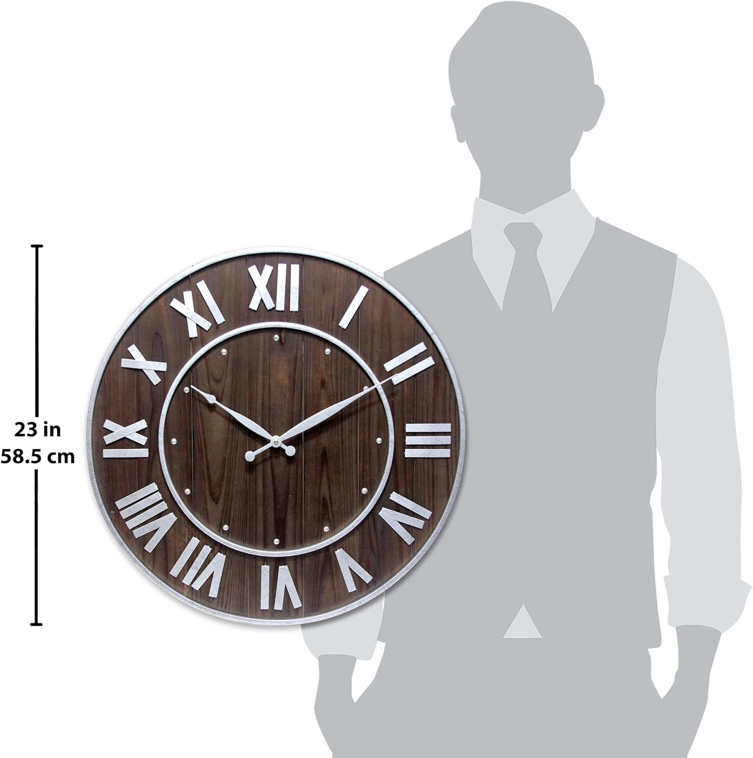 The Wine Barrel-Dark Brown is a traditional indoor wall clock that is rustic and refined. Measuring 23”, this decorative indoor wall clock features a brushed brown wood finish and raised silver Roman numerals and hands. Its open-face design allows for easy viewing of the time no matter where it hangs in your home. Additionally, the Wine Barrel-Dark Brown features quartz movement for accurate time keeping. The versatile and sturdy open-faced design works with most décor schemes. If you are looking for a clock that is rustic and rugged, the Wine Barrel-Dark Brown is for you.