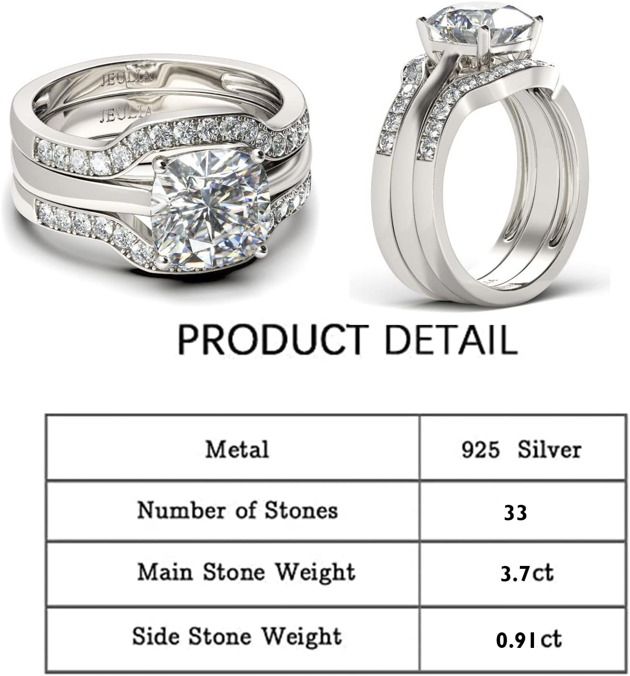 With Jeulia, jewelry is more than an accessory - it represents something much meaningful. Through jewelry, we're afforded the ability to not only personalize a look, but also evoke emotion and create memories. This is the very mentality Jeulia is founded on; we create premium, artisanal jewelry that embodies both who you are and what you stand for.Jeulia.com is owned and operated by Jeulia Limited. Designed and handcrafted in-house at our state-of-the-art studio headquartered in Hong Kong, each beautiful piece is custom-made to be as unique and authentic as you are. True artisanship comes from caring hands - not an assembly line - which is why our workshop always puts quality and more importantly - you - first.Preminum package:There are jewelry boxes, message cards, boxes and handbags. The best products deserve the best packaging. If you are looking forward to an gift for wife, mom, husband, daughter or friends, girls, This women rose gold 3PC wedding ring sets will be the perfect gift, halloween jewelry for Valentine's Day, Birthday, Mother's Day, Anniversary, Thanksgiving or Christmas.Jewelry Maintenance and Precautions:1、Often clean it with a soft-hair brush or cloth to make it keeps stunning and often looks like new.2、Keep it dry and please remove your Jewelry before bath or swim to prevent jewelry case alkali products.3、When not wearing, be sure to thoroughly dried and stored in the original package or a cloth pocket.Setting information:Stone Color : Diamond WhitePrimary Stone:1/3.7ctSide Stone:32/0.91ctWidth -11.9 mmHeight -6.3mmThickness -7.4mmMetal : 925 SilverStone Shape :Cushion,round