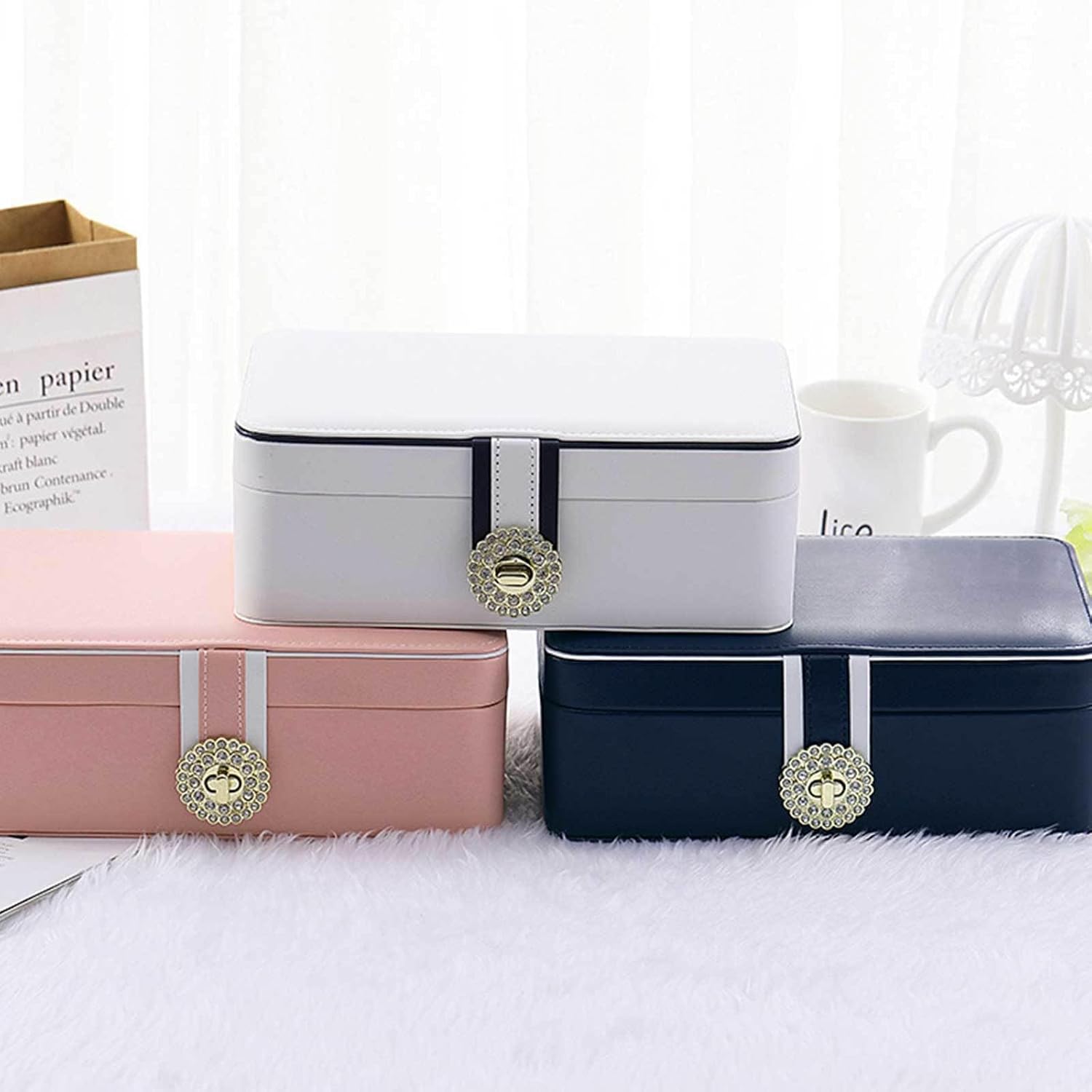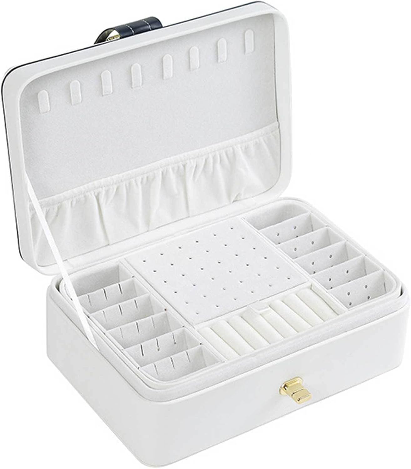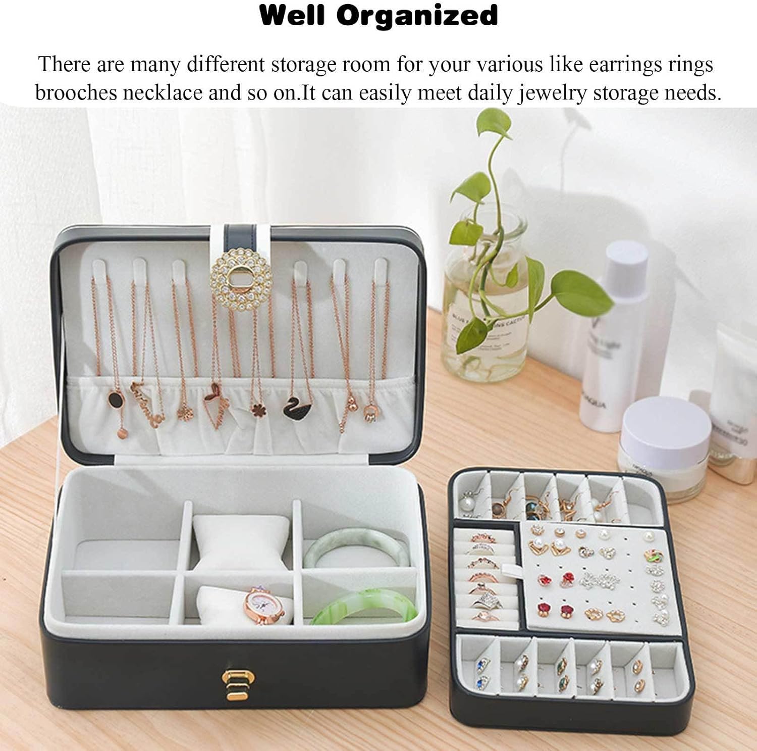 2 Layer Large Capacity Jewelry Box Cases? Overall Dimensions: 9.25 x 6.30 x 3.54 inches;? 8 hooks at the top lid for hanging necklaces and pendants you can tuck the chain into lower elastic shirred catch pocket to stay in place and prevent tangling also pocket can organize more bigger jewelry item;? Mid tray include 12 compartments ring slot and earring plate to store rings cuffs earrings studs brooches and other keepsakes;? Bottom compartment with 6 equally divided sections for storing bigger bracelets or less often worn jewelry;? This compact jewelry case interior is made of velvet soft and anti-tarnish it can keep your jewelry well protected against scratches and marred.The jewerly box is a breeze to organize your dresser, nightstand, bathroom counter or vanity, saves lots of space to make your room neater.