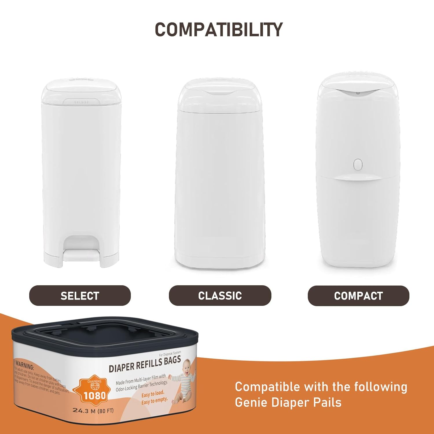 COMPATIBILITY: The Jumbo+ Square Refills Disposal Bags Refill Compatible with Diaper Genie Compact Pails, Classic Pails and Select Pails. FEATURES: Keep your litter area clean and free of odor for a more pleasant home environment with this Diaper Pail Refills Bags. Diaper Pail Refills Bags built-in odor barrier technology to contain odors until you're ready to throw the trash out. Plus, Each cartridge contains 80 FT, hold Up to 1080 Newborn-Sized Diapers Per Refill! PACKAGE CONTAINS: 3 X Jumbo+ Square Refills Note: This is not a OEM product. Any use of the brand name or model designation for this product is made solely for the purpose of demonstrating compatibility.