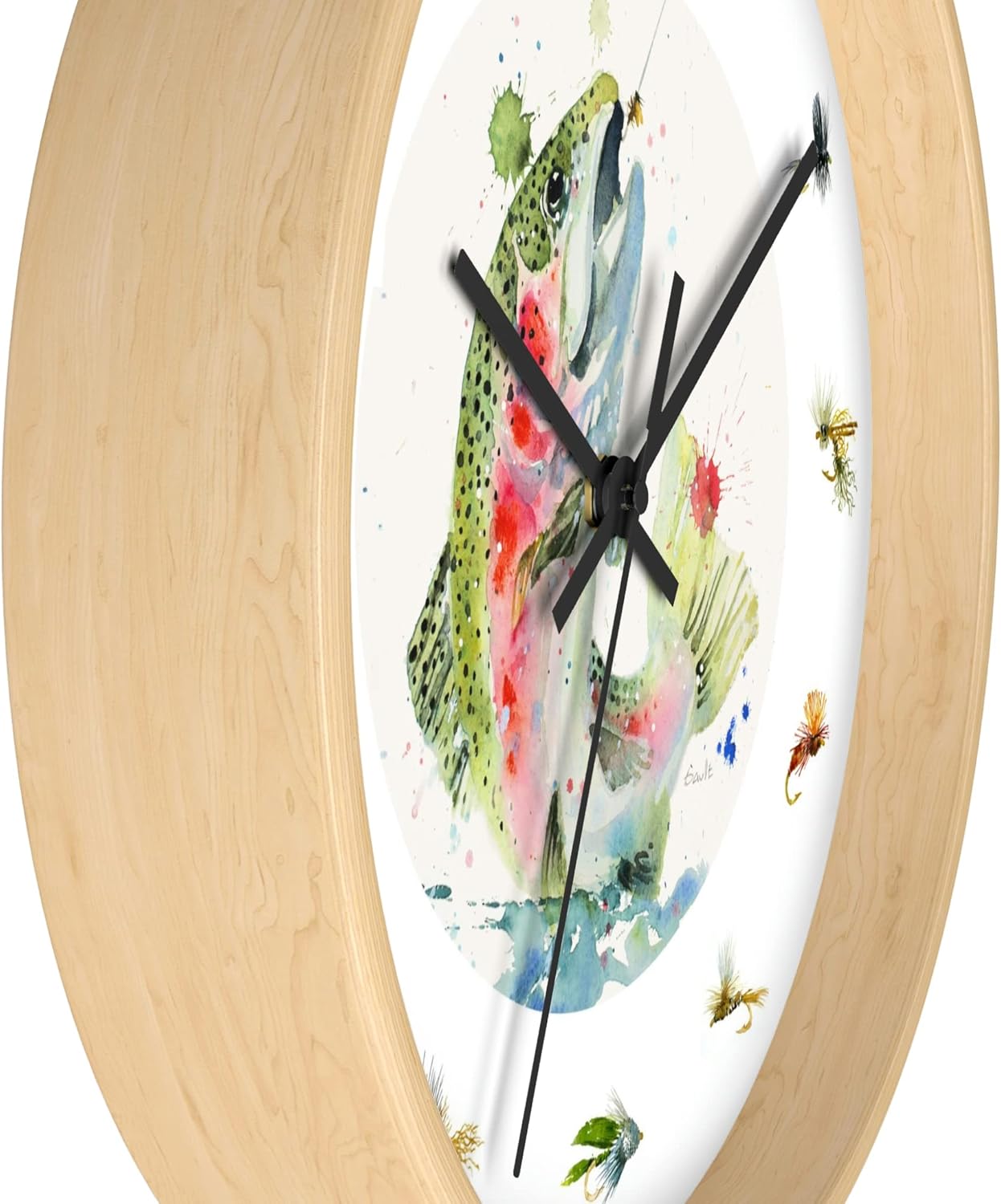 The fly fisher person in your life will enjoy this beautifully illustrated wall clock featuring watercolor paintings of a jumping rainbow trout and 12 popular fishing flies. Fit for any room of the house, office or cabin, the clock is 10" in diameter, has a silent mechanism (no ticking) and comes in 3 different frame colors. The artwork was created by Tim Gault — an award-winning watercolor artist — and is printed with high-quality digital printers to ensure a high-resolution detailed print with vibrant colors. Each clock is individually inspected prior to shipping for print quality and to ensure full and proper functionality. It’s shipped in a recyclable cardboard box with folded insert that stabilizes and protects the product during shipment.