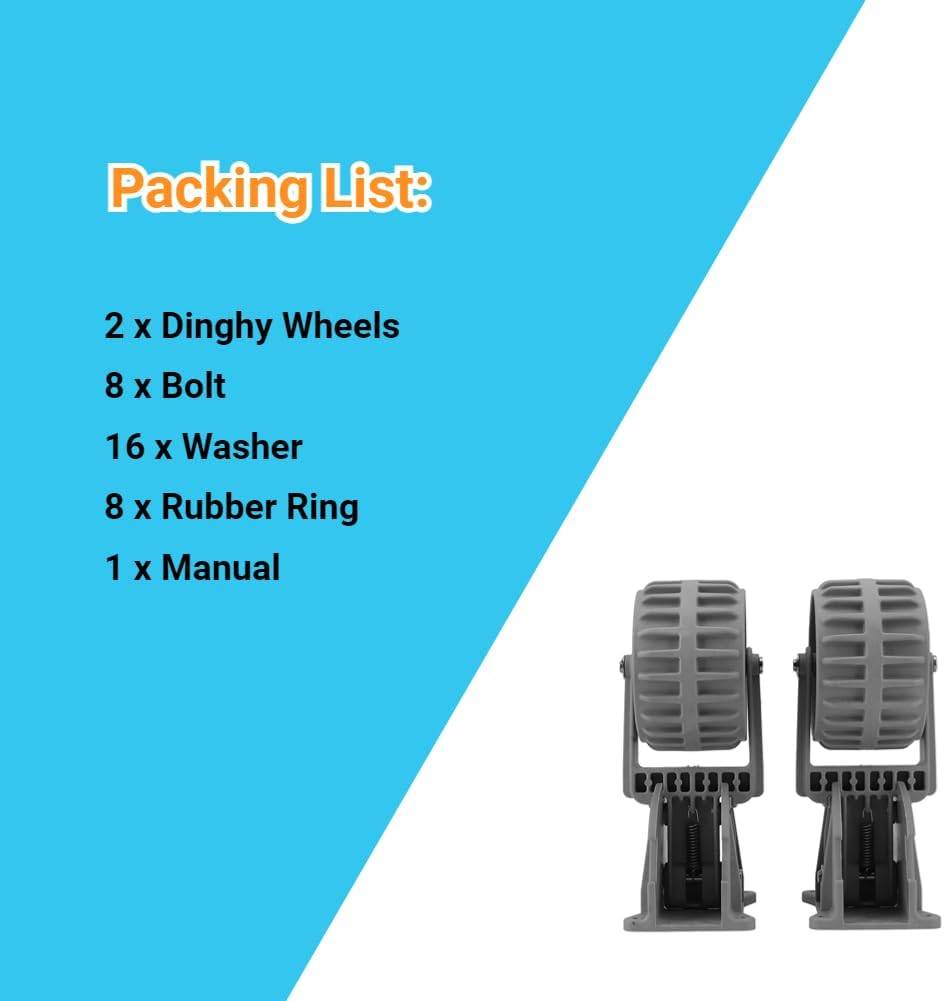 Feature:1. Dimensions: Wheel height is 320mm/12.4in, diameter is 136mm/5.3in, width is 86mm/3.4in, mounting plate size is 150x100mm/5.91x3.94in.2. Prevent Boat Damage: Inflatable boat launching wheel will avoid damage to your boat due to boats movement, with a steering wheel locking device.3. Easier to Move Dinghy: This dinghy towing wheel is easy to mount to the bottom of your boat to move your boat on the beach or other ground.4. Premium Material: Made of graphite filled nylon resin with high abrasion resistance, high temperature resistance, and durable.5. Practical Wheels: Launch wheels fit in behind the tubes and transom of even the smallest of craft without obstructing movement of the outboard motor.Specification:Item Type: Dinghy WheelsMaterial: NylonQuantity: 1 PairWheel Height: Approx.320mm/12.4inWheel Diameter: Approx. 136mm/5.3inWheel Width: Approx. 86mm/3.4inMounting Plate Size: Approx. 150x100mm/5.91x3.94in, 4 Fixing HolesFunction: Avoid damage to your boat due to boats movement, this trailer wheel has a steering wheel locking device to move your boat on beach or other groundApplication: Fit for Inflatable Boats, Aluminum Jon Boats, dingies Boats, and Dinghy Raft Package List:2 xDinghy Wheels8 x Bolt16 x Washer8 x Rubber Ring1 x Manual