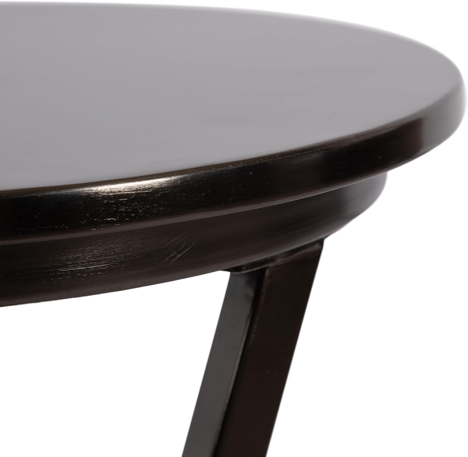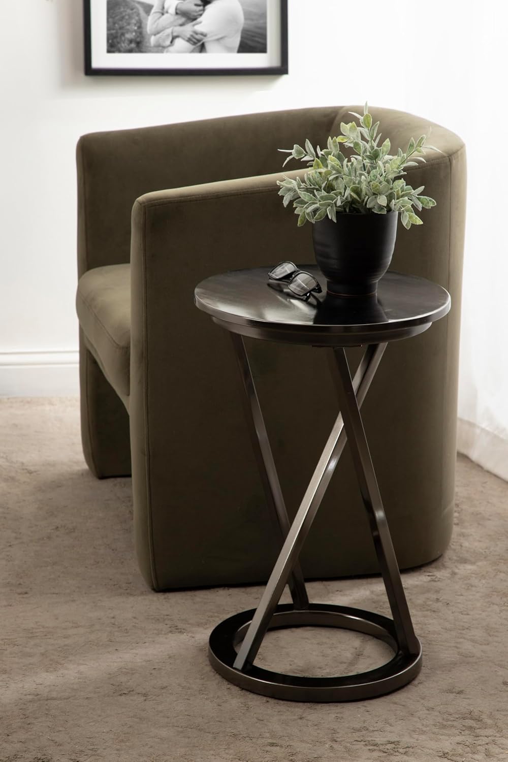 Introducing the Kate and Laurel Aja round side table, a delightful blend of charm and modern elegance. Crafted with meticulous attention to detail, its gray gunmetal finish adds a touch of edgy sophistication. The circular tabletop features a smooth brushed metal finish, creating a captivating focal point that effortlessly enhances your decor. Whether you place it next to your favorite armchair, sofa, or bed, the Aja side table exudes a sense of refined style and functionality. The unique slanted legs add an intriguing visual element to this already distinctive piece. Made from sturdy metal, it provides excellent stability and durability, ensuring the table remains steady and secure. With its versatile design, this decorative end table complements a wide range of interior styles, from vintage and retro to contemporary and eclectic. This exquisite side table features a compact size with dimensions of 15 inches in diameter and a 23-inch height, making it the perfect accent piece for any room in your home. Use it to display your favorite decorative items, such as potted plants, photo frames, or art pieces, and instantly elevate the aesthetic appeal of any space. Its timeless design allows it to seamlessly transition between different rooms and spaces as your decor evolves over time.