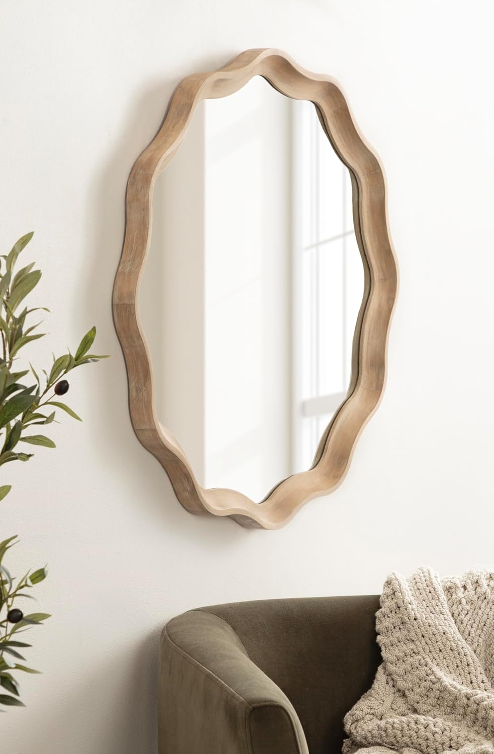 This mirror is perfect for unleashing your inner decorator and transforming your space with a modern transitional look. The Hatherleigh was designed with robust natural wood, providing high-quality durability, an authentic woodgrain, and a light natural finish. The scalloped round shape is perfect for introducing soft curvature and trending wavy profiles. Its overall dimensions are 28 inches in diameter with a frame depth of 1.5 inches, creating a commanding statement piece that functions well in various spaces. Use the Hatherleigh mirror to bring vibrancy to your space, using the wide surface area to increase the spread of light and make your room appear brighter. It looks great all throughout your home or office, pairing well over the mantel, console table, sofa, bed, and much more. If you're looking to start renovating your bathroom with a relaxing vibe, the Hatherleigh works well as a bohemian bathroom mirror for a single or double vanity. Hang this mirror in a matter of minutes with the metal D-ring hangers attached to the sturdy back.