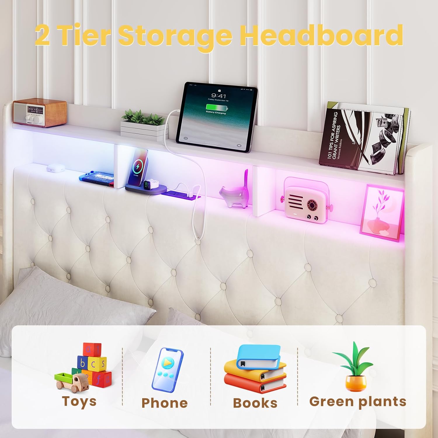 Crafted with premium velvet fabric and featuring a uniquely designed headboard, footboard, and integrated LED lights, this platform bed seamlessly blends sophistication with functionality. Perfectly suited for any home décor, it transforms into a stunning centerpiece for your bedroom, elevating both aesthetics and ambiance. Experience the perfect harmony of luxury, comfort, and modern design Product Specifications : - Product Color: Beige - Product Material: Velvet+Metal Frame - King Size: 87"L x 79.7"W x 48.4"H Package Include? 1 x King Size Upholstered Platform Bed Frame 1 x Accessory Bag 1 x Instructions