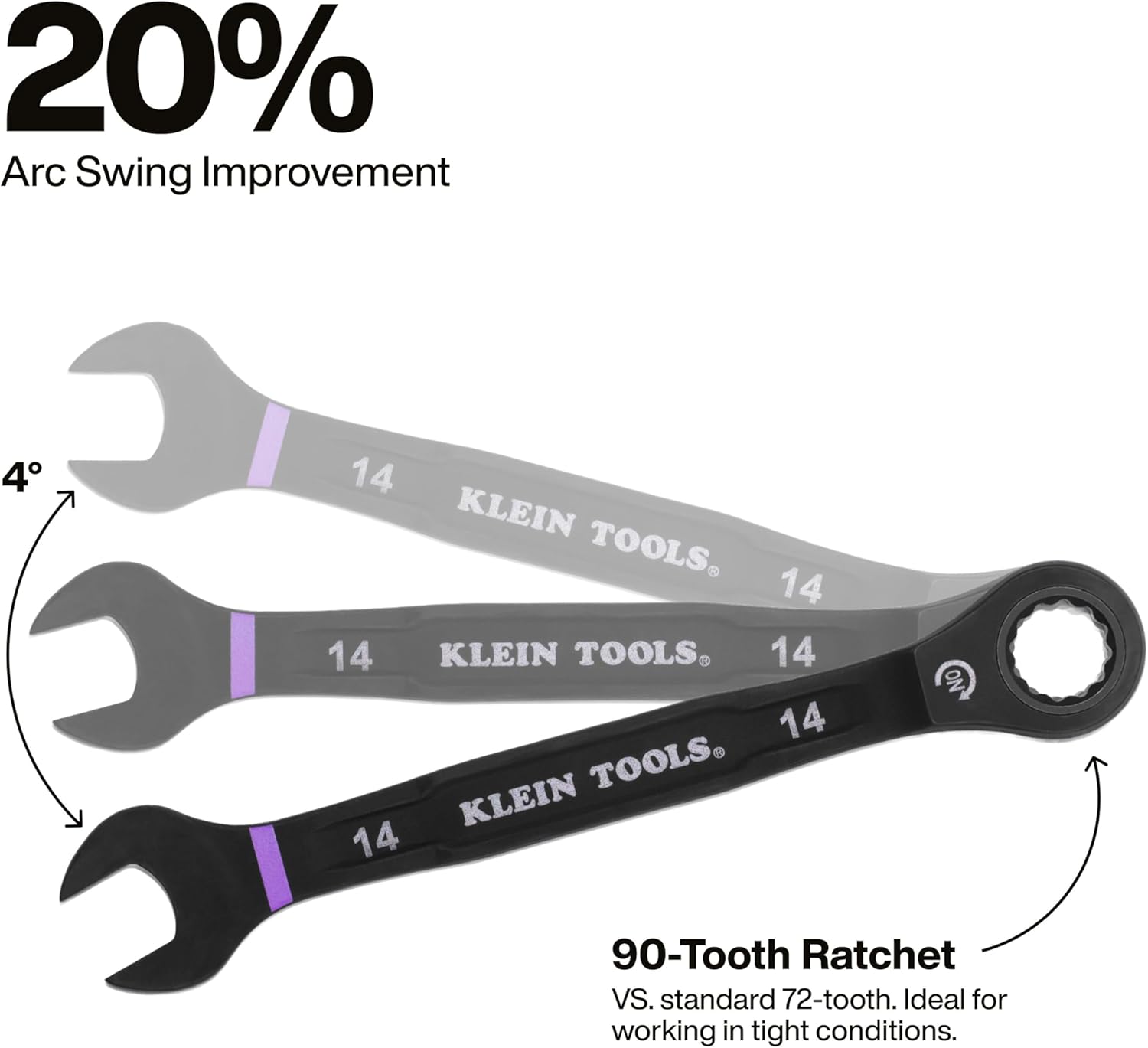 The Klein Tools 18-Piece Ratcheting Combination Wrench Set is designed for versatility and efficiency. It includes 18 SAE and metric sizes to handle various tasks, while the 90-Tooth ratchet minimizes arc swing for better access in tight spaces. The MODbox accessory case keeps tools secure and organized, and the color-coded size markings and laser-etched "on" and "off" indicators ensure quick identification and ease of use. For more than 160 years, Klein Tools has manufactured premium-quality, professional-grade hand tools that deliver the performance, durability and precision needed to get the job done right. Our family of engineers, workers and craftsman continue to put six generations of expertise into every tool we create by using only the highest quality materials, superior workmanship, and keeping manufacturing as close to home as we can. Klein isn't just the name of our company, it's also our family name. And since we're an American company that's family-owned and family-run, you know you can count on us to be here tomorrow. Klein Tools doesn't just make great products, we make great products that stand up to the demands of the professionals who use them every day ... Since 1857.