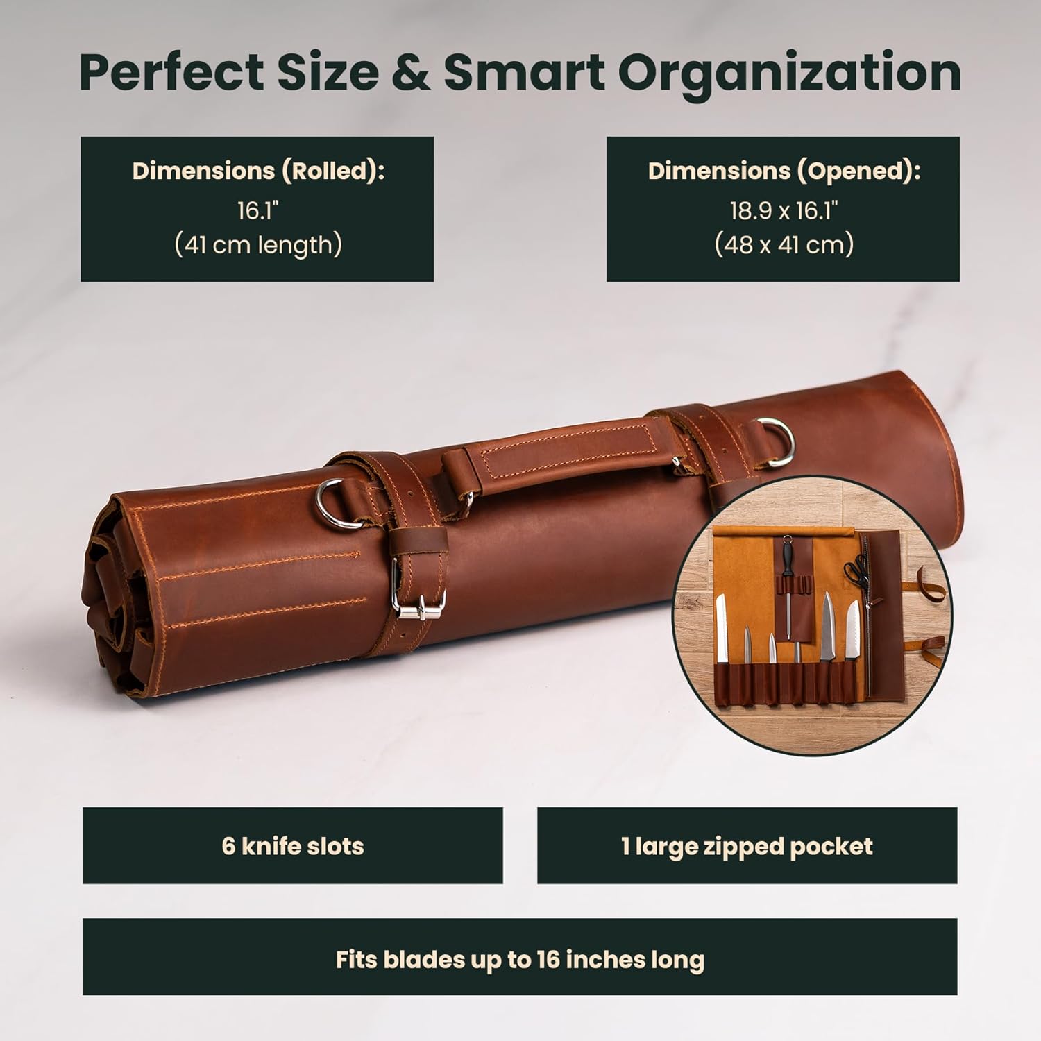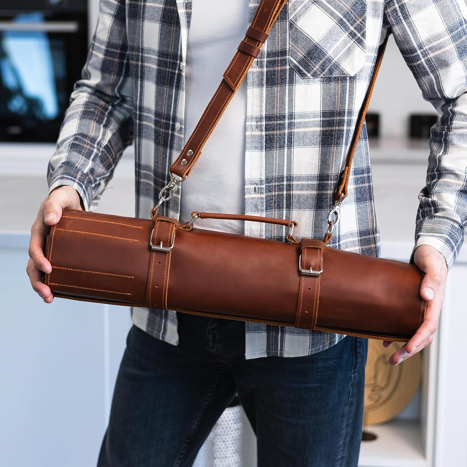 Upgrade your culinary gear with this Handmade Leather Knife Roll Bag, designed for professional chefs and cooking enthusiasts. Size & Capacity Measures 20″ (51 cm) when rolled and 18.9″ × 20″ (48 × 51 cm) when open. Includes 6 knife slots for blades up to 16″ plus a zippered pocket for tools, scissors, or small accessories. Premium Full-Grain Leather Crafted from thick, durable full-grain cowhide leather that matures beautifully over time, developing a rich patina with every use. Built to last a lifetime while keeping your knives secure. ✈️ Travel-Friendly Design Portable and practical – the roll-up design saves space and makes it easy to carry. Comes with a sturdy adjustable shoulder strap and handle, perfect for chefs on the move, culinary students, or outdoor cooking. Secure Storage Each knife slot is reinforced with strong stitching and protected by a leather flap, keeping your knives safely in place. The roll closes with durable straps and solid metal buckles for extra security. Perfect Gift for Chefs An ideal gift for professional chefs, cooking students, or home cooks who appreciate timeless craftsmanship and functional design. Knives not included.