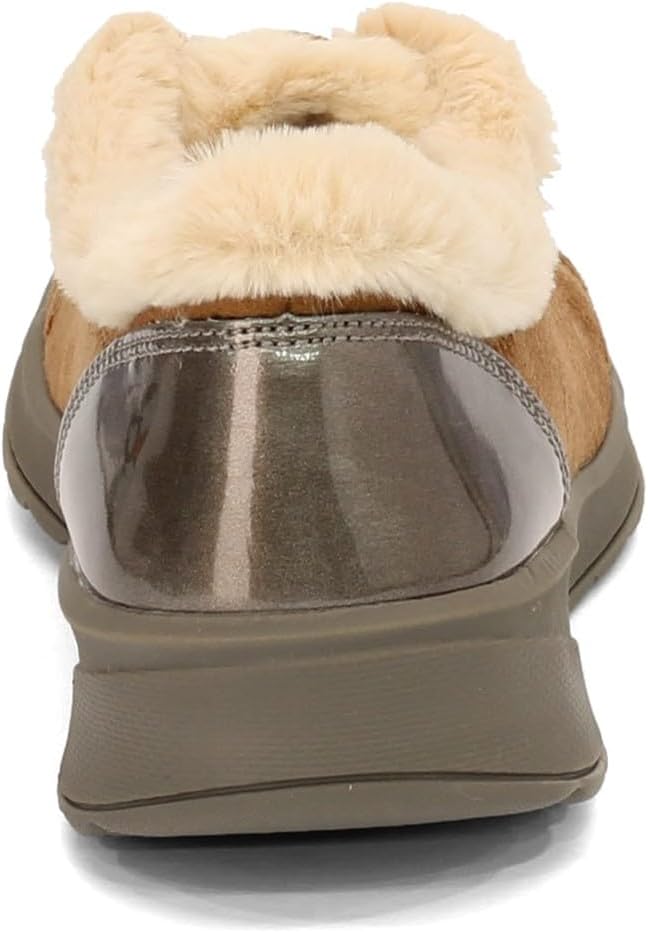 Slip-on faux lace upper using stretch fabric with interior faux fur lining. Bzees cloud technology, machine washable materials. Comfort cone gel insert in the heel of the outsole for additional benefits and shock absorption.